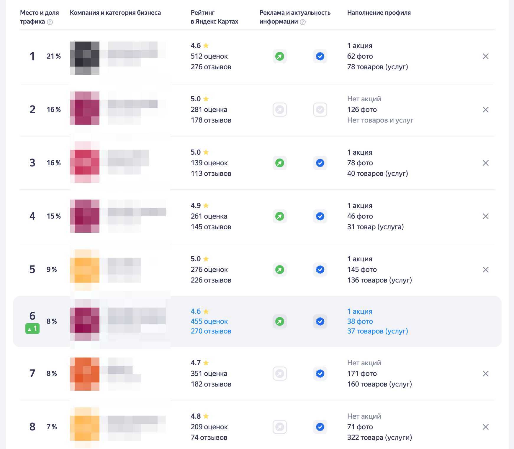 Мы видим список компаний, место, долю трафика, рейтинг, количество оценок/отзывов. Например, лидер получает 21% внимания пользователей, а наша компания на 6 месте с 8%.