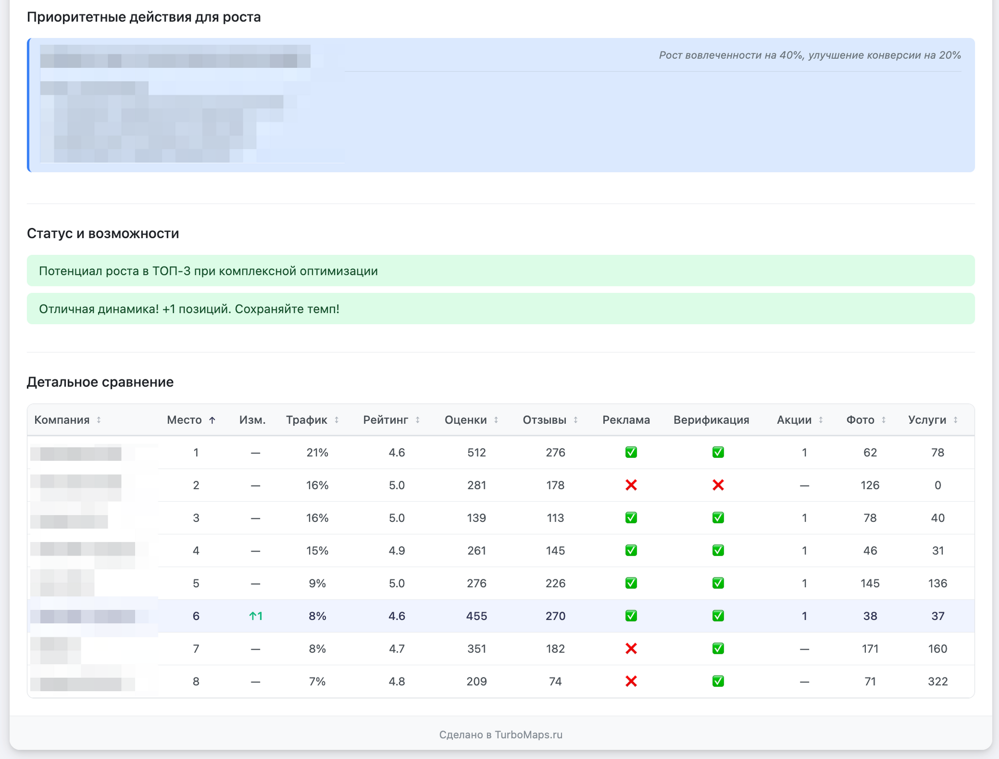 Именно поэтому мы в TurboMaps создали свой инструмент «Анализ конкурентной позиции». Мы берем те же данные, что и Яндекс, но обогащаем их и представляем в виде, который понятен за 3 секунды и сразу говорит, что делать.