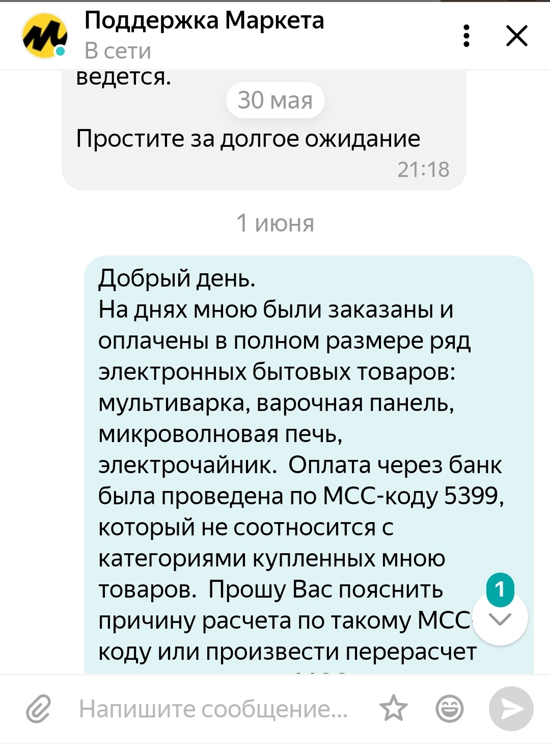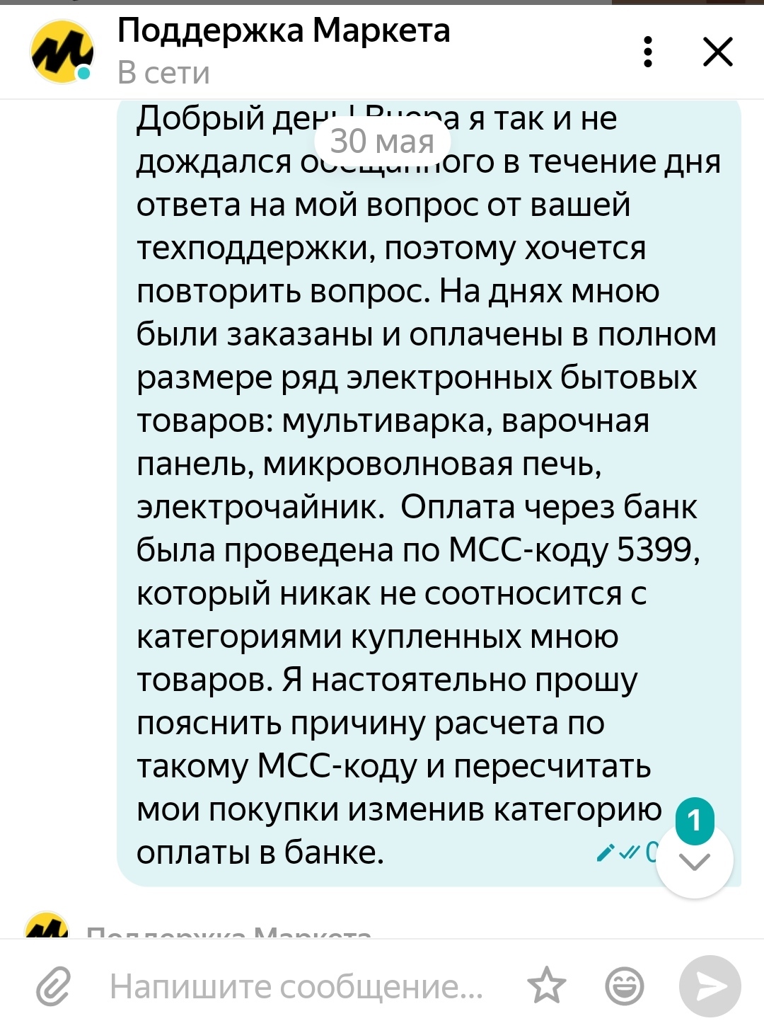 Сделал четыре заказа на приличную сумму специально в яндекс-маркете для получения повышенного процента по карте за данные покупки. Банк обещал начислить 5% кэша с покупки, если это будет покупка в магазинах по продаже бытовой техники. И, конечно же, Яндекс-маркет провел оплату по МСС-коду 5399 "товары общего потребления", в то время как моему банку требуется МСС-коды 5044, 5045, 5065, 5722, 5732, 5734, 5946, 5997, 7379, 7622, 7629, о чем я, кстати, специально предварительно узнавал в банке.