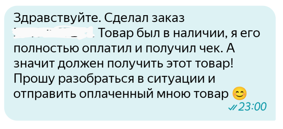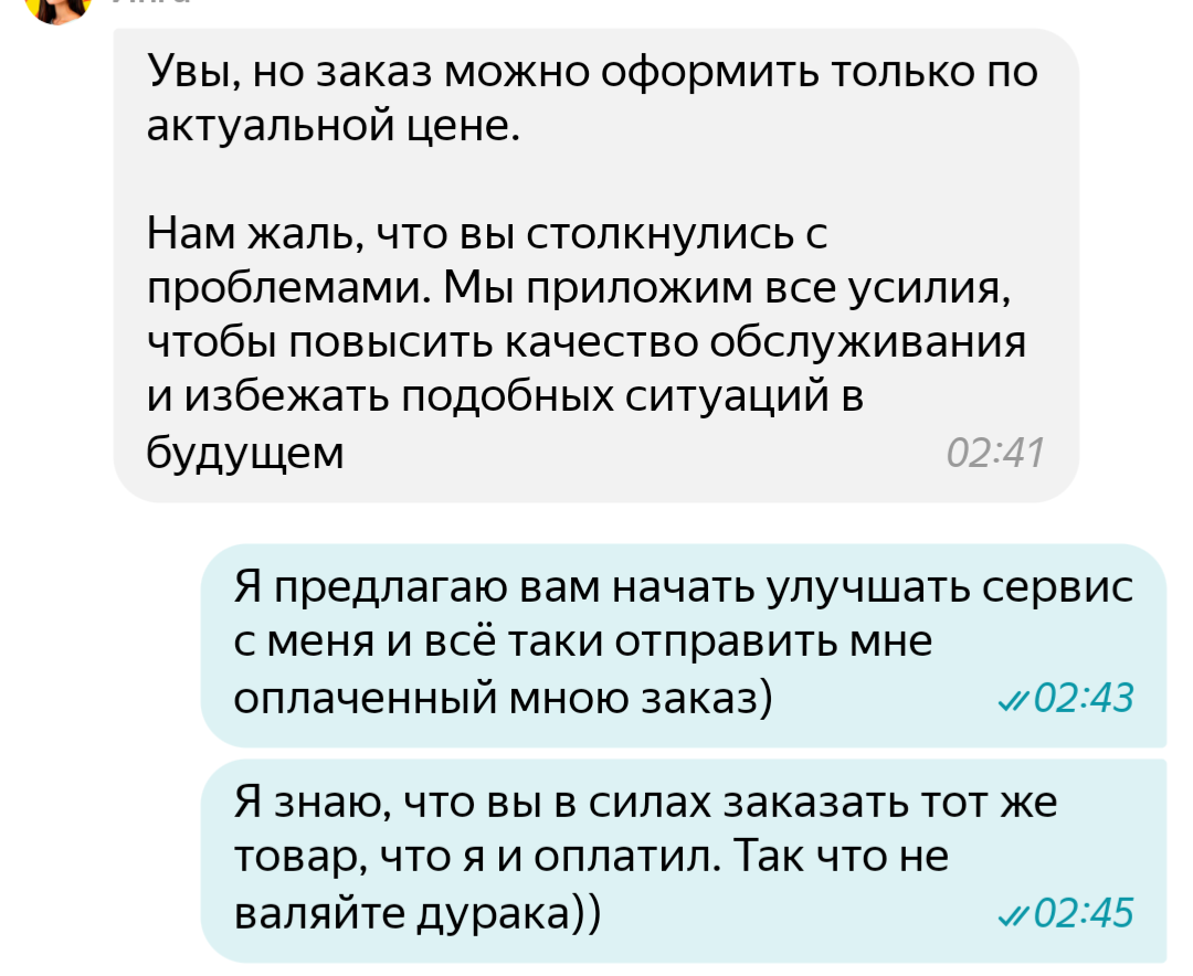 На мои доводы о том, что как минимум их правила не могут быть выше закона РФ, а как максимум выставляет их площадку в дурном свете — я получал простые отговорки о бесконечных обещаниях сделать сервис лучше и заказать товар у другого продавца по более высокой цене. Делать сервис лучше они не собирались.