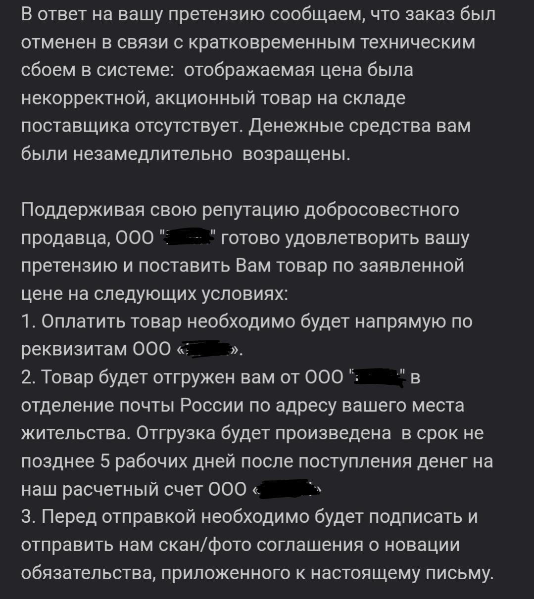 Сам же магазин (не маркетплейс!) оказался порядочным и после первого же обращения извинились за технический сбой и предложили отправить товар по изначальной цене.