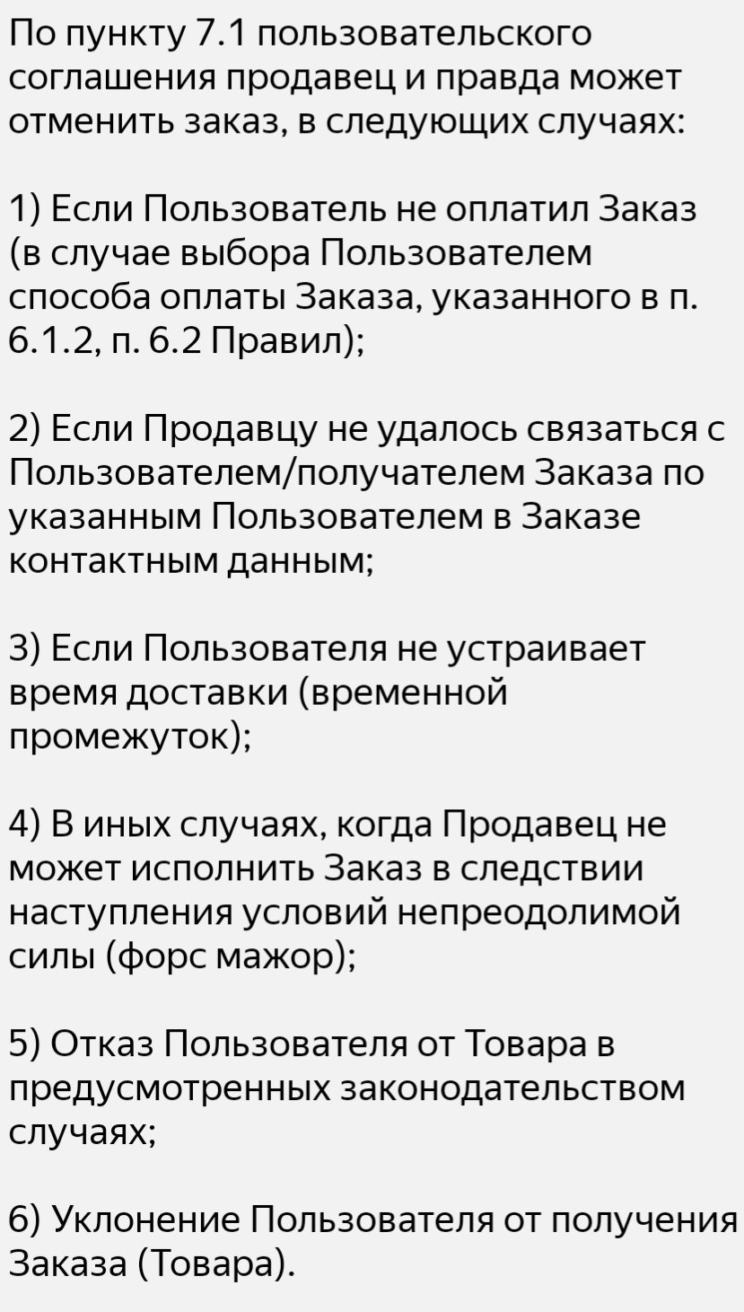 Но все мои дальнейшие аргументы в пользу закона и адекватности со стороны сервиса ударялись об каменную стену поддержки: периодическими игнорируя, в течении двух дней они отбивались от меня, ссылаясь на пункт 7.1 их ПС. Самое забавное, что даже в этом пункте ни одна причина не подходила под мой случай.