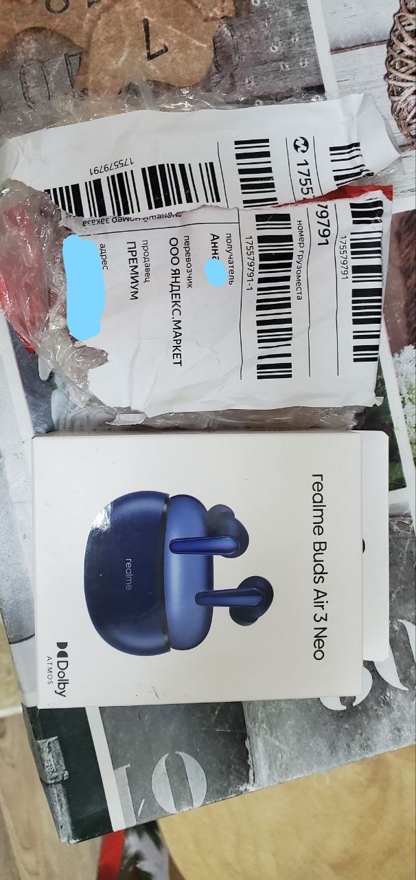Я болею, потому доставку заказали на дом курьером, не в ПВЗ (пункт выдачи). 3-го же вечером жена встречает курьера, забирает посылку, где- то через час я до неё добрался, распаковал, гля, а наушники- то привезли другие, дешевле раза в 2. Привезли realme buds air 3 NEO.