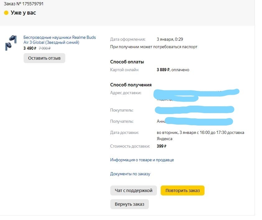 3 Декабря (в 0.20, считай, ночью 2-го) с аккаунта жены заказали наушники Realme buds air 3 (global) на маркете, ибо с промокодом (на тысячу) там дешевле всего (3400+ доставка), доставка 3-го вечером, отлично, ждём-с.
