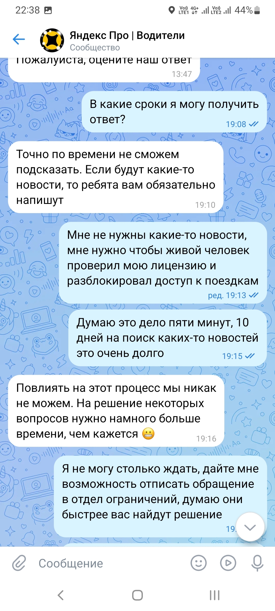 Прошу Яндекс такси в конце концов заняться моей проблемой и разблокировать мне доступ к программе, иначе вас постигнут кары небесные, роспотребнадзор и суд. Ей богу, проблема выеденного яйца не стоит, а вы месяц не можете разобраться.