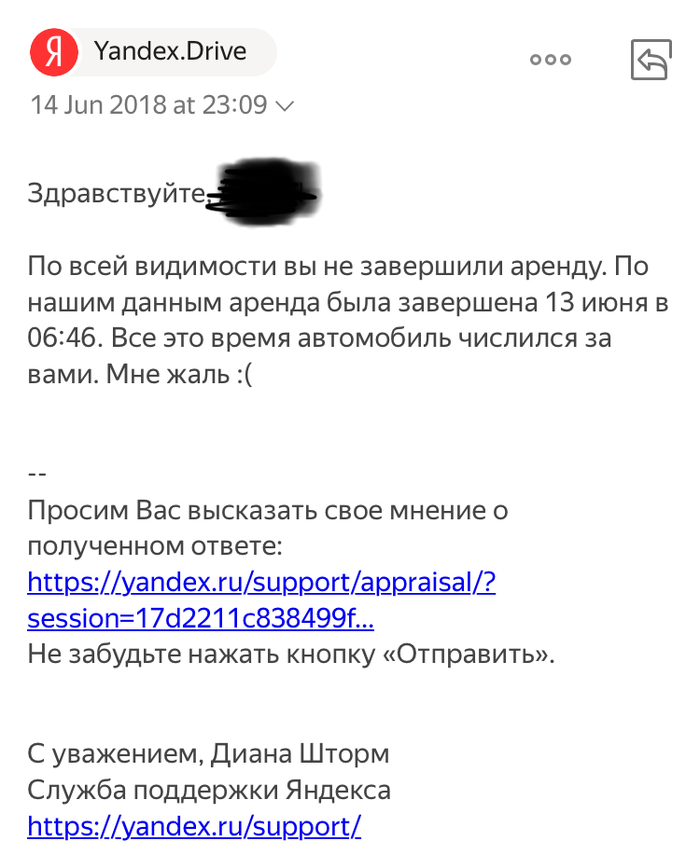 Хорошо, сажусь писать письмо. Объясняю ситуацию, что автомобиль использовался только 40 минут, аренда была завершена как обычно, остальное время автомобиль находился на одном месте, что они и сами могут отследить. На что получаю замечательный ответ: