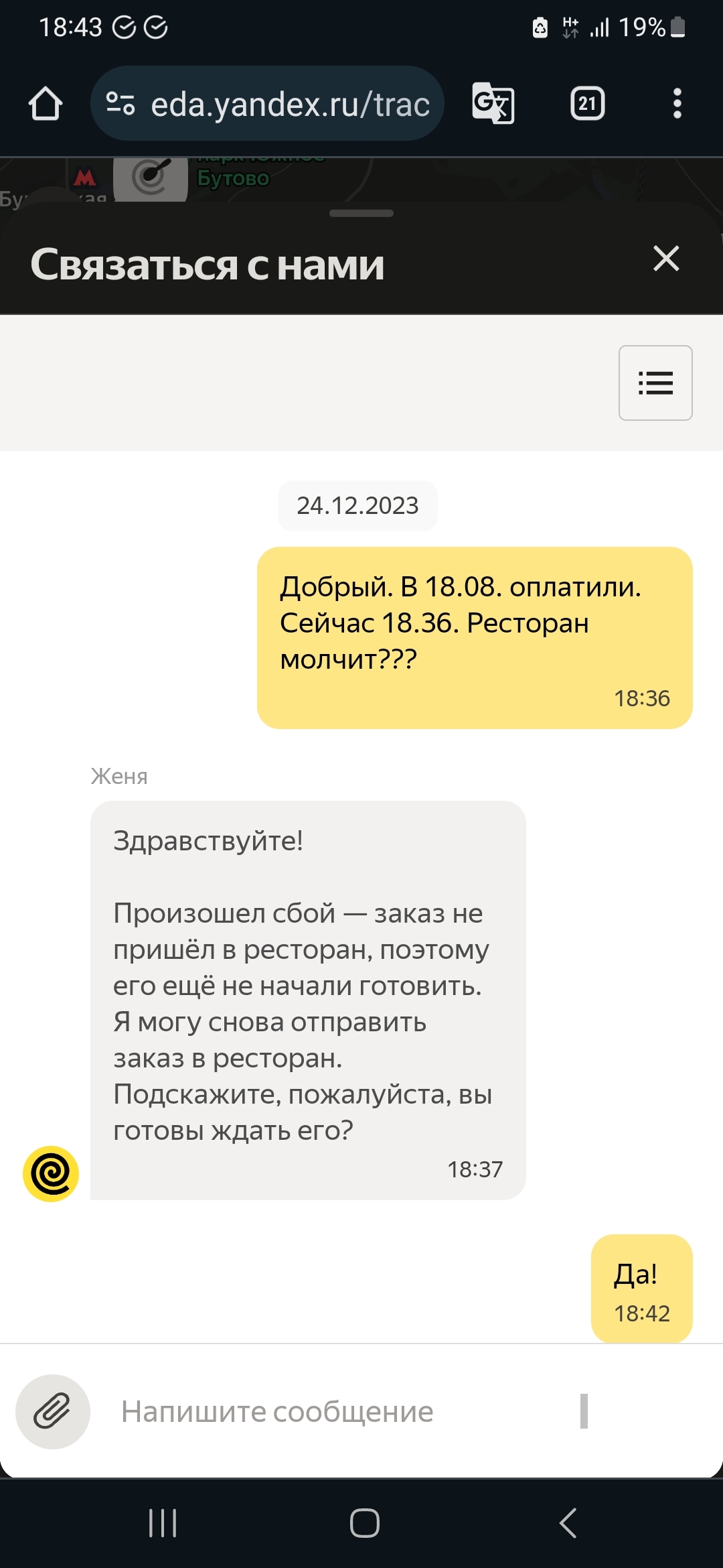 5074glav Яндыкс #yandex , ты фу 1 год назад Заказ в 18.08. До сих пор (19.04).не передан ресторану. Не люблю эти хинкалы, но гости просят! Почти час тупят. [моё] Яндекс Москва Мое отношение Длиннопост Ещё 0