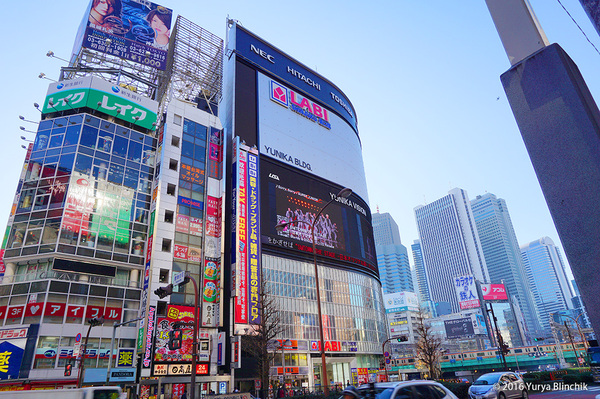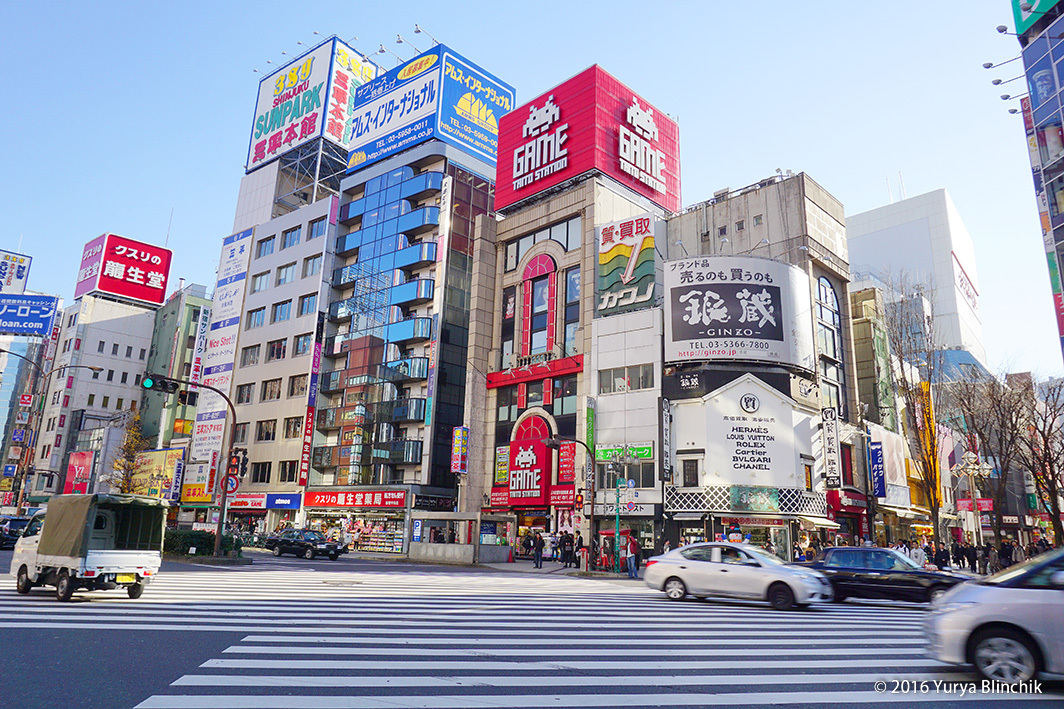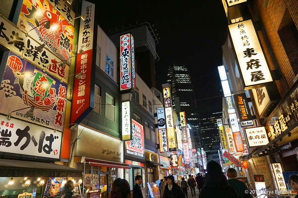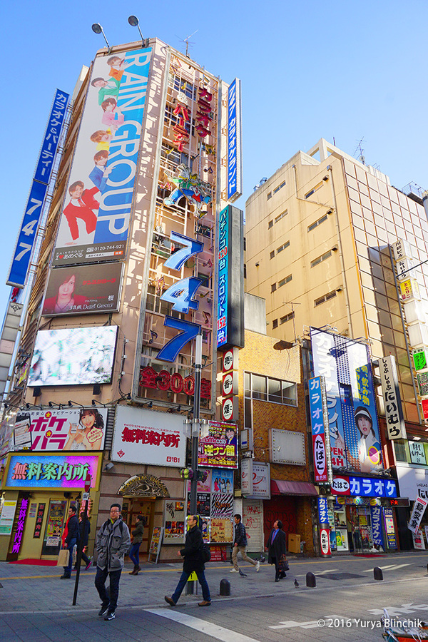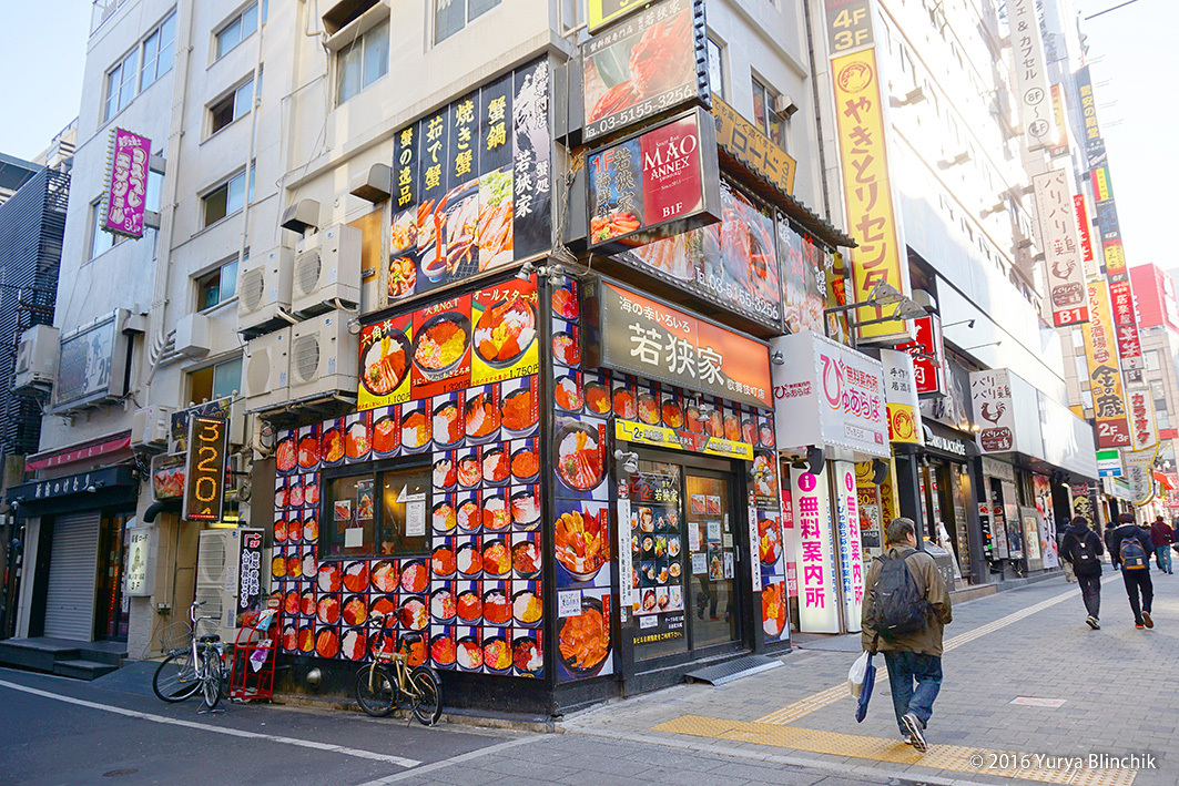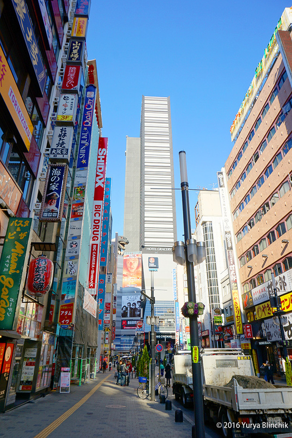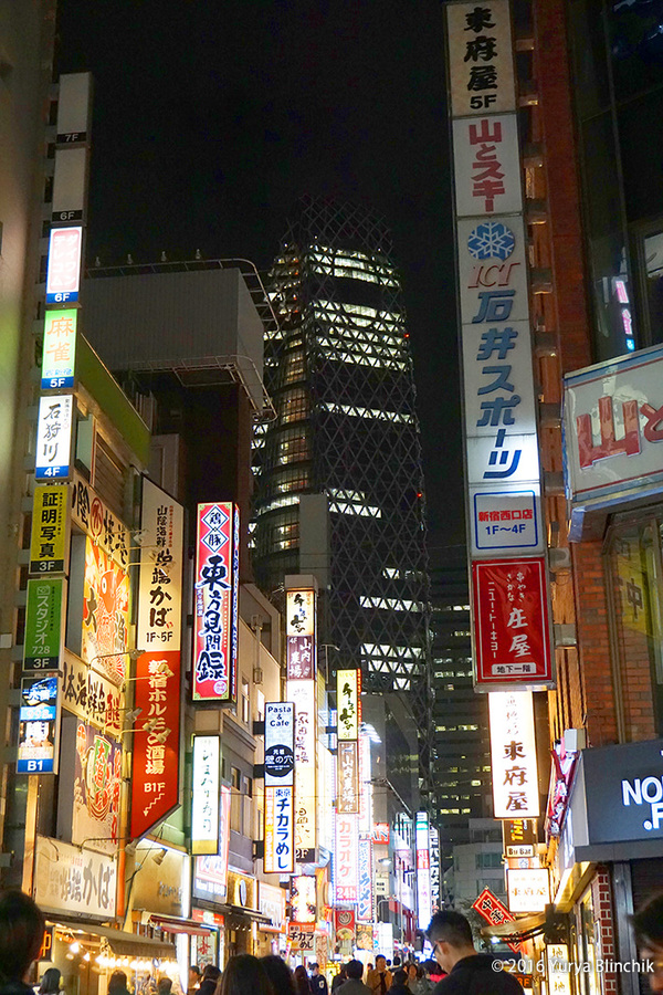 Но стоит пройти немного в сторону, как на смену величественным офисным зданиям приходят разноцветные вывески всевозможных магазинов и ресторанов. Теперь перед нами предстаёт Синдзюку в совершенно другом обличии.