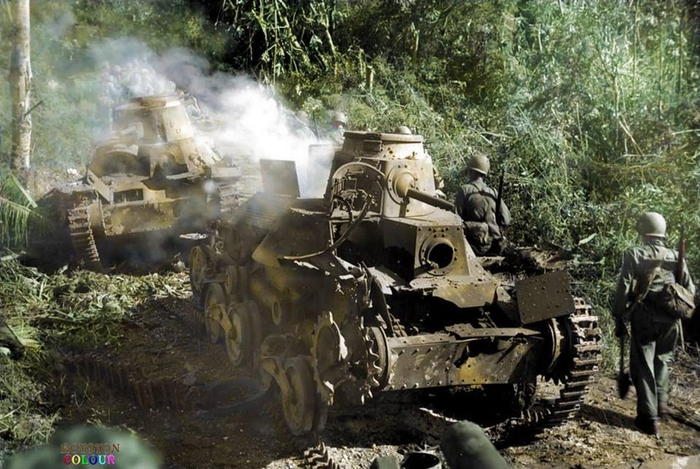 Из состава уцелевшей танковой роты были выделены две машины - средний танк Тип 97 и легкий Тип 95. К лобовой броне танков прикрутили мощные заряды взрывчатки и поставили обе машины в засаду в зарослях бамбука на узкой горной дороге.