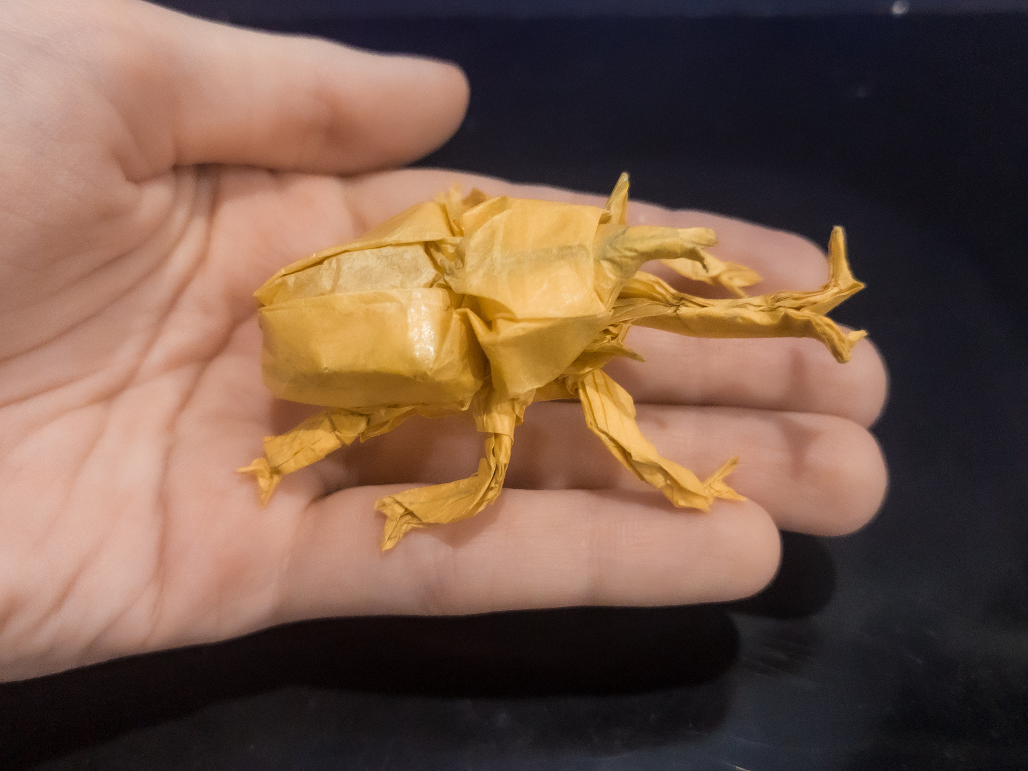 Получился жук примерно 7 см в длину. Считай, натуральный размер, забавно. Придавала форму с помощью воды и местами пришлось склеить слои вместе. Делала его, наверно, часов 6.