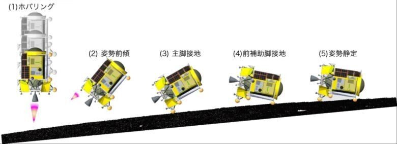 На снимке виден сам аппарат после посадки, которая, несмотря на точность, прошла не так, как планировалось - главный двигатель модуля направлен вверх, хотя должен быть направлен вбок. Это говорит о том, что второй этап посадки, при котором аппарат должен был встать на боковую часть, не был выполнен. Такая ситуация привела к тому, что солнечные элементы SLIM в настоящее время не функционируют должным образом. В JAXA считают, что на заключительном этапе прилунения аппарат мог потерять тягу второго двигателя.