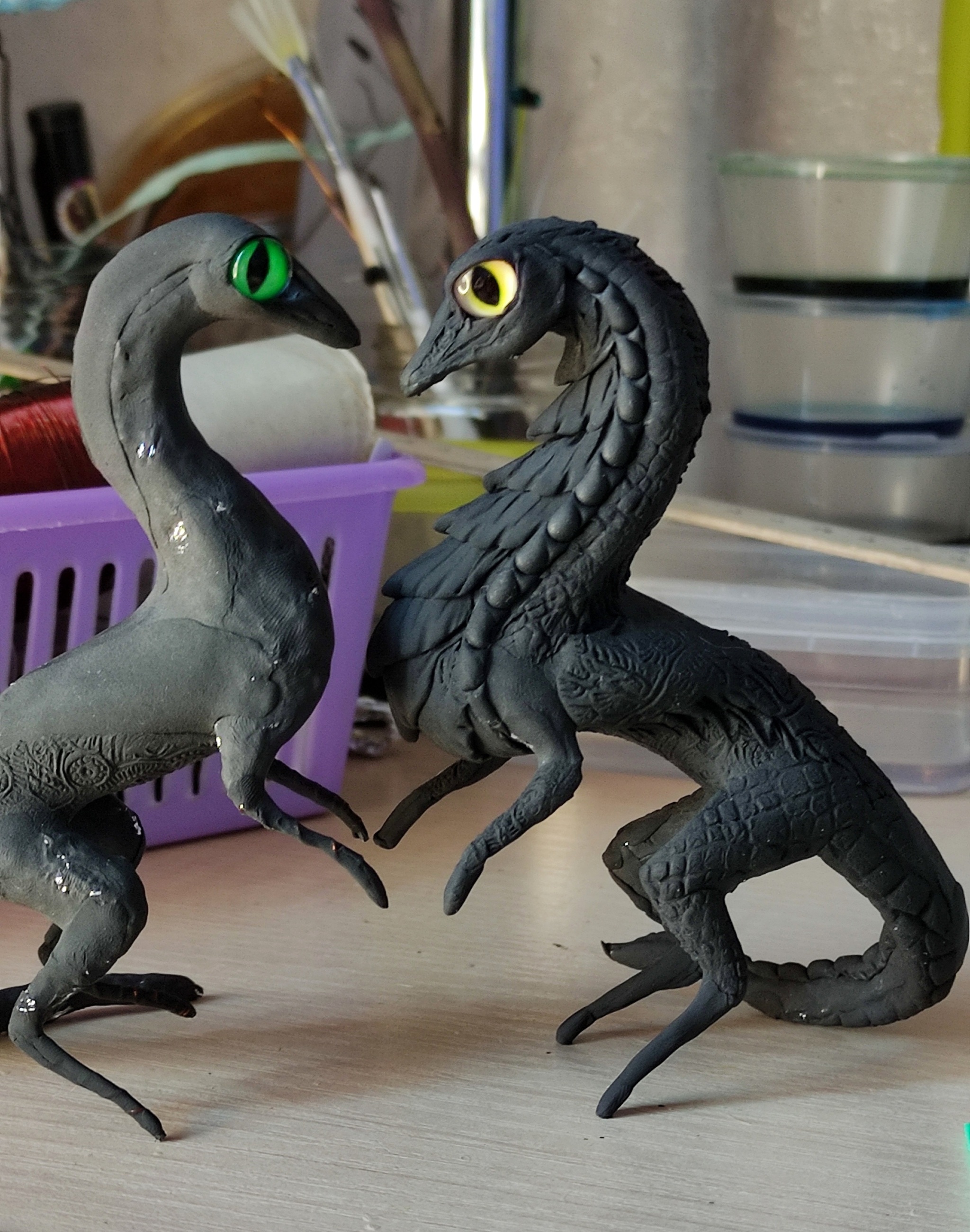 Теперь немного процесса. Сделаны драконы на проволочном каркасе, масса набиралась фольгой (на фото ещё кое-где просвечивает фольга). Затем сама лепка: