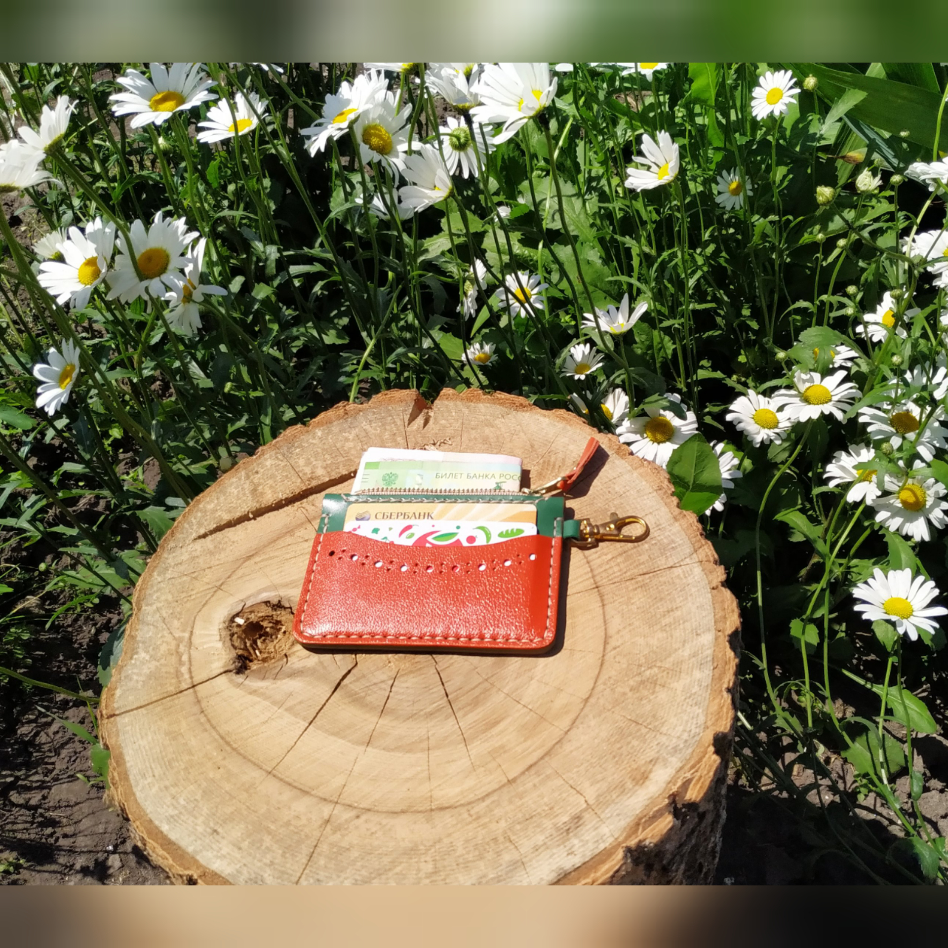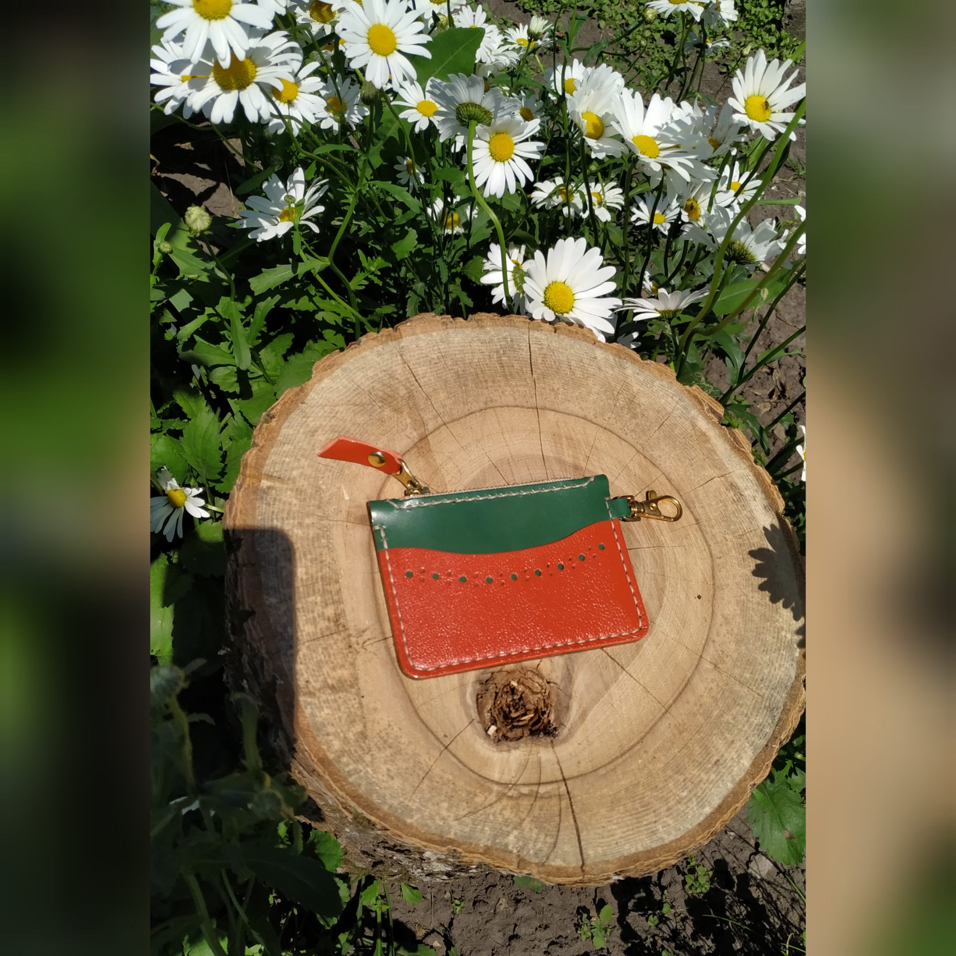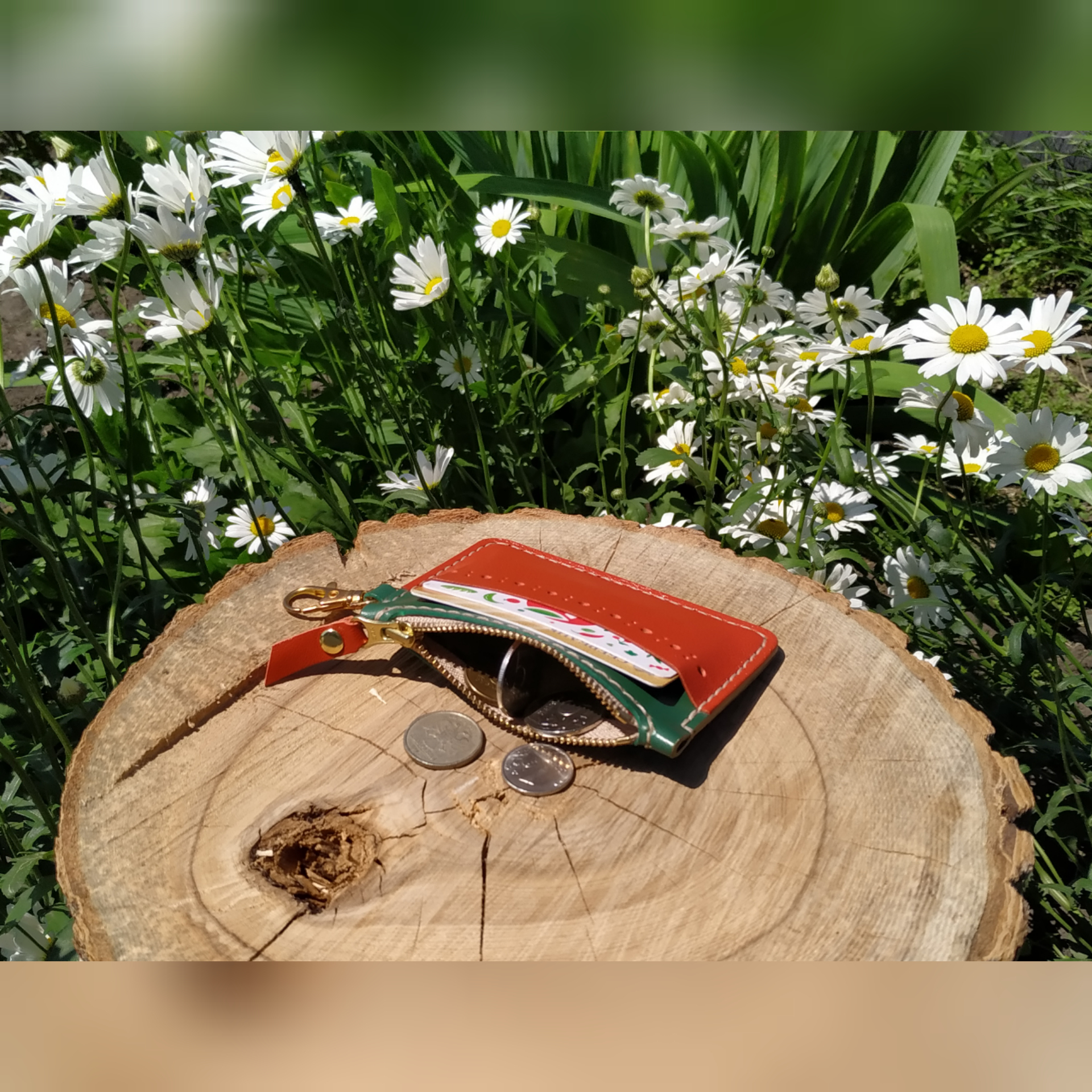 Компактный картхолдер с двумя отделениями для карт и отделом на молнии для монет и сложенных вдвойне купюр. Зелёная кожа КРС классико вердуро, оранжевая коза, кровавая - кенгуру. Нить st point 0.6 мм цвета "солома". Молния латунная YKK.