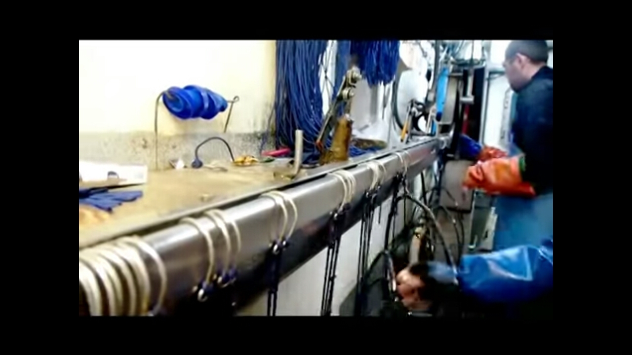 Выше схема порядка яруса которым в большинстве случаев работают в российских водах. От якоря до якоря используются те кассеты которые вы вооружали количество их может быть разное в среднем при длине кассеты 1000 крючков от 5 до 12 тысяч крючков используется в одном порядке. Во время постановки все пять человек находятся в ,,бунгало,, это такой контейнер или зашитая палуба на корме где находятся все кассеты наживочная машинка. Да наживление сейчас используется автомат ручного почти нет поэтому про него не пишу. Здесь саму машинку не видно но видно рыбу которую подают чтоб когда крючки соскальзывали с рельсы и проходя через наживочную они насаживали ровные кусочки селёдки.