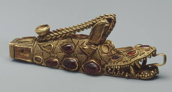 Фигура дракона из Каряжского городища близ Ставрополя. Датируется пятым веком. Пожалуй, один из самых эффектных древних драконов. Описание находки: "золотая фигурка дракона с широко открытой пастью, с двумя высокими треугольными выступами, изображающими, по-видимому, уши или рога зверя и с крыльями в виде двух стержней, спаянных из трёх тонких витых пластин. Поверхность фигурки украшена овальными вставками гранатов в высоких гнёздах. Пространство между ними заполнено треугольниками из зерни. Высоко поставленные глаза обозначены круглыми гнёздами. Из пасти чудовища высовывается длинный язык в виде петли из тонкой пластины. По сторонам четыре больших клыка и два ряда мелких зубов, выполненных пирамидками из зерни. Сзади фигура дракона оканчивается втулкой, на которой сверху и по сторонам сохранились прямоугольные гнёзда для вставок." http://ru-sled.ru/izobrazhenie-drakona-v-iskusstve-iv-v-veko...