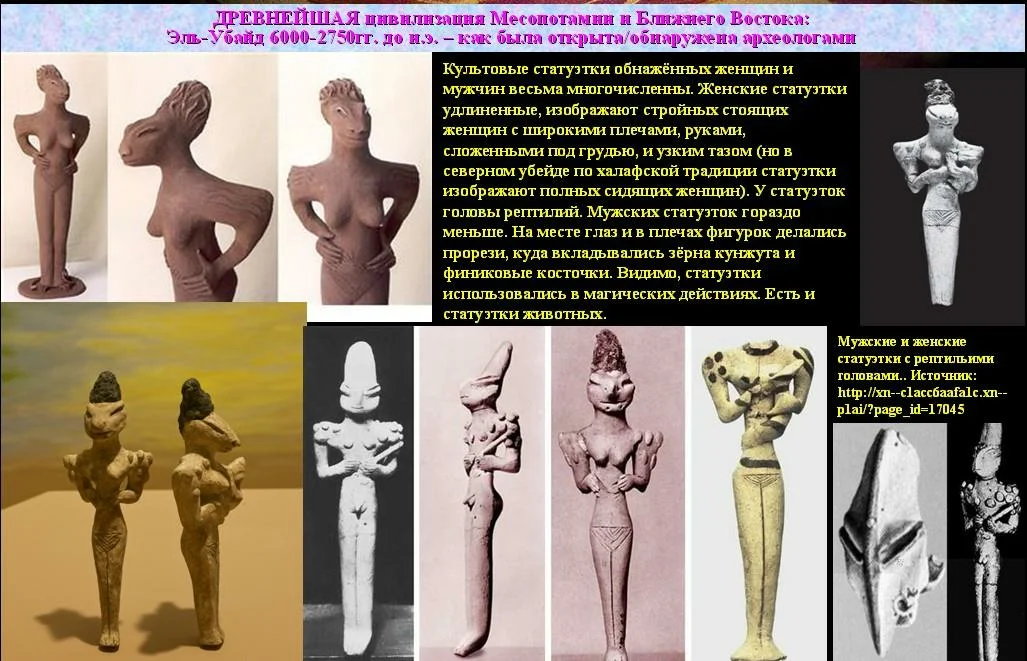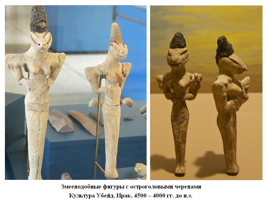 Змееподобные фигуры культуры Убейд, Месопотамия (территория современного Ирака). Таких статуэток рептилоидов там было найдено очень много. Любопытно, что большинство статуэток изображают женщин. По всей видимости, эти фигурки имели культовое значение.