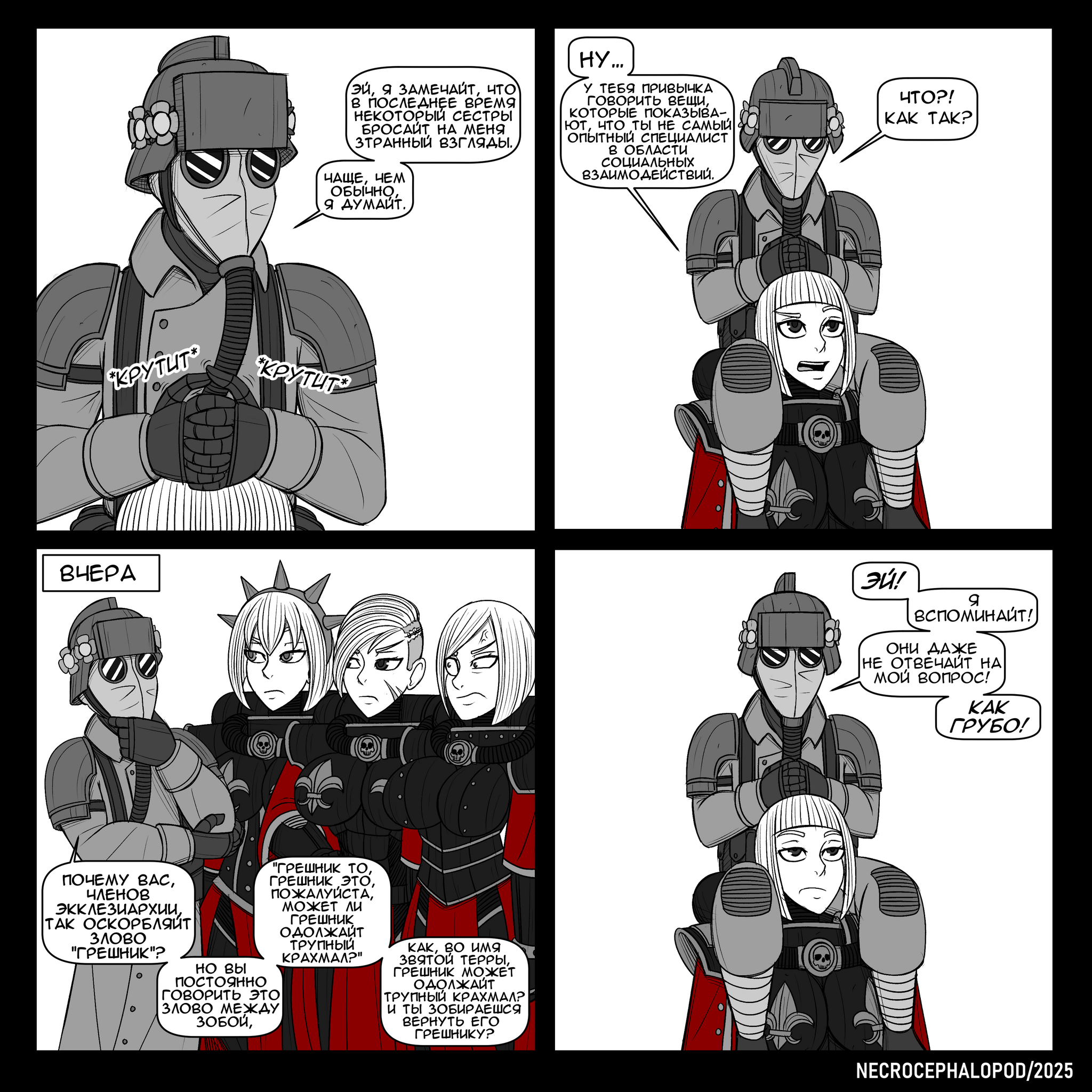 "О, и ещё кое-что, почему "Надежда" зчитается первым шагом на пути к разочарованию? Я иметь в виду, разве не это в первый очередь помогайт человечеству выжить? Не говоря уже о том, что Готт-Кайзер являет воплощение надежда во вся Империум. И почему каждое положительное злово и значение, как правило, воспринимайтся крайне негативно? Я видеть подобный вещи во многих цитатах из книг. Зочувствие, зчастье, доверие, ты знайт это? Для межзвездный империя, единственной целью которой является выживание человечества, такой образ мышлений, без зомнения, является полной противоположностью всему, чего хотел Готт-Кайзер, вы понимайт, о чем я говорить?" - Рядовой Курт Крицкриг из Корпуса Смерти Крига.