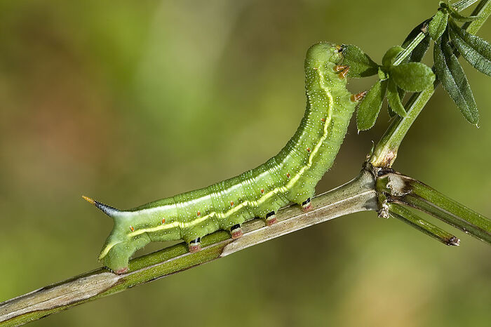 Яйца самка откладывает на листьях подмаренника, и вышедшие из них гусенички 2 недели с аппетитом хрустят сочными листьями, не забывая активно расти.