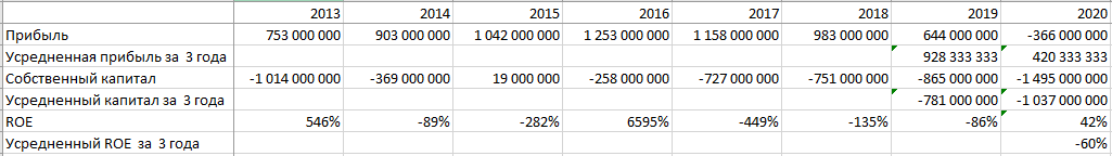 Если рассматривать компанию по ROE в году 2012, выглядит она очень заманчиво. Но после 2012 все уже не кажется таким прекрасным, несмотря на хороший рост чистой прибыли. У компании отрицательный капитал, ROE не посчитать. Усредненная прибыль за 16 лет упала. Если сделать скидку на ковидный год, который вырубил ряд отраслей как Тайсон Фрейзера. То прибыль выросла в 1,3 раз. Капитал ушел в глубокий минус.