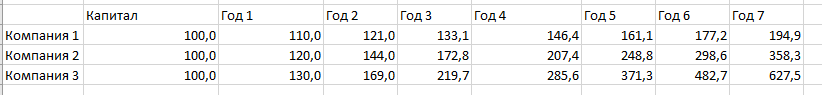 Предположим, что данные не будут меняться со временем. Аппроксимируем их на длительное количество лет и посмотрим на рост капитала. Очевидно, что капитал будет расти быстрее у компании с наивысшим RОЕ.