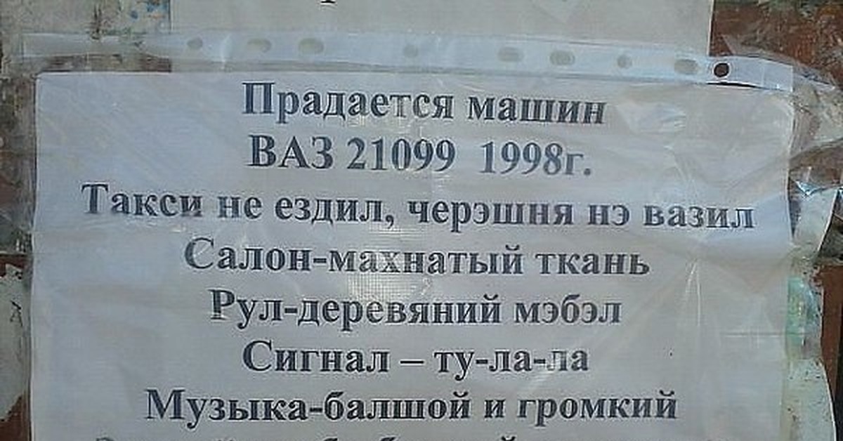5 iq.KAPABAH Юмор Эх, Паэду пасматру. Нада брадь, раз чэрэшна нэ вазыл! :) 1 день назад Юмор Фотография Смех (реакция) Объявление Продажа Машина Ваз-21099 Доска объявлений Акцент Продажа авто 3 1 Ещё 0