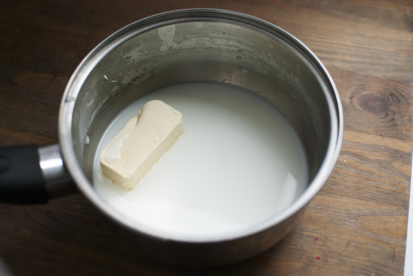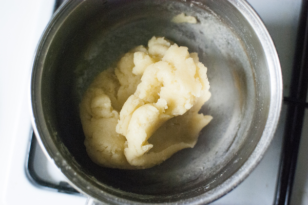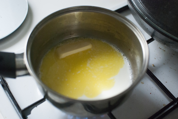 1. В ковшик наливаем 75мл воды, 75мл молока. Кладем 1 ст.л сахара, 50г сливочного масла, щепотку соли и нагреваем до растворения масла. Я взяла полпорции, потому что даже из половины выходит порядка 10 эклеров, мне этого и так за глаза хватает.