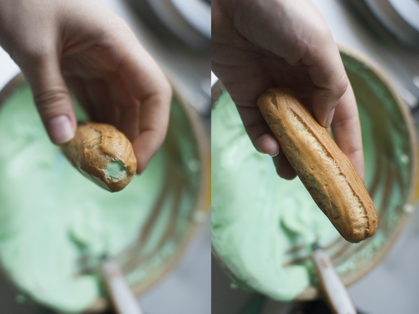 Перекладываем его в мешок. Есть специальные насадки для эклеров, но я использовала обычную. Также вы просто можете разрезать эклер вдоль и выложить крем. А потом закрыть как крышечкой.