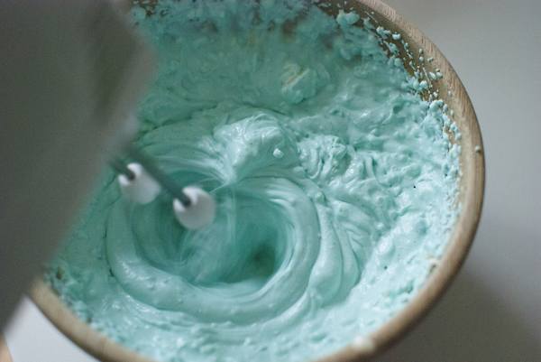 10. Пока эклеры выпекались, я сделала начинку. Ванильный заварной крем я взбила со сливочным сыром (у меня от торта остался подкрашенный крем на сливочном сыре).