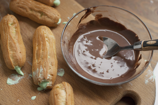 Наполнили все эклеры, убрали излишки крема и растопили шоколад. Теперь аккуратно макаем эклеры верхней частью в шоколад, даем стечь лишнему и оставляем.