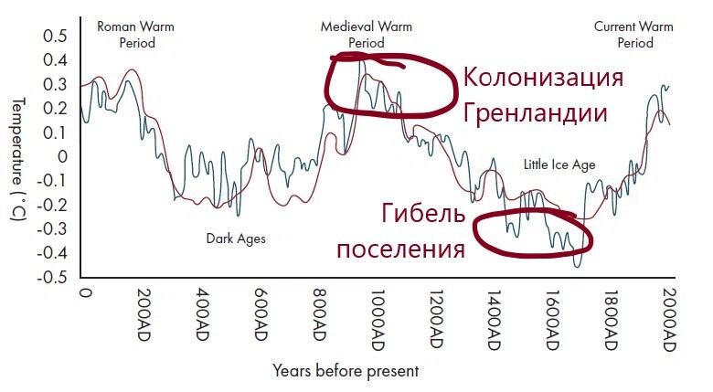 Всем им сильно повезло с погодой. В конце X века как раз был разгар температурной аномалии, названной Средневековым тёплым периодом. Правда, был ли Гренландия тогда действительно зелёной — история умалчивает. Вероятнее, что Эрик просто гениально прорекламировал новый остров — ведь его родина называлась как раз Исландией, «Ледяной землёй».
