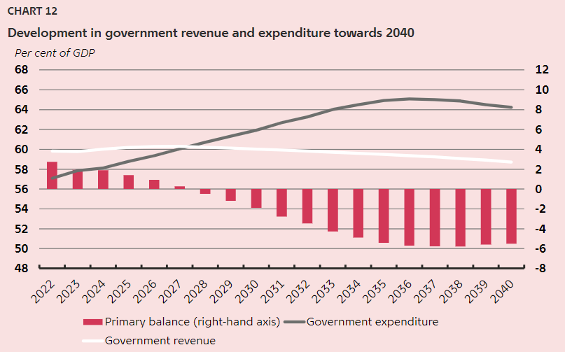 Уже сейчас на острове только 27 тысяч пар рабочих рук, это всего 48% населения против 60% в Дании. А когда на пенсию уйдет самая большая группа (50-60 лет) произойдет полноценный коллапс. Датский Центробанк уже бьет тревогу: ожидается, что при сохранении текущей финансовой ситуации, дефицит бюджета из-за растущих социальных выплат приобретет хронический характер уже в 27 году и выйдет на уровень почти 6% от ВВП.