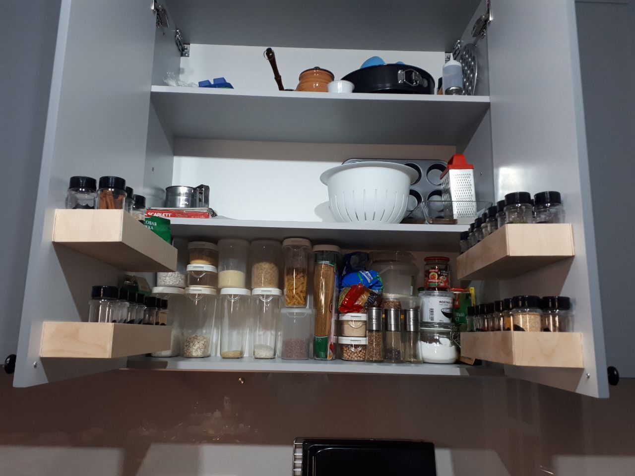 Похвастаюсь - сделала себе сама вот такие полочки для специй (фото ниже). Ещё не везде у меня всё так хорошо организовано, но я на верном пути