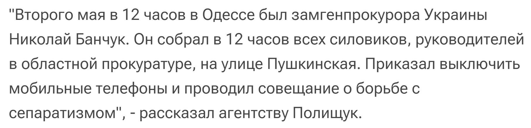 Доказательством того, что трагедия в Одессе 2 мая 2014 года была не случайностью, а запланированной операцией, является визит в город замгенпрокурора Украины Николая Банчука, который изолировал местных силовиков, чтобы они не могли остановить беспорядки, заявил РИА Новости бывший депутат городского совета Одессы Василий Полищук, бывший свидетелем тех событий, а затем занимавшийся их расследованием.
