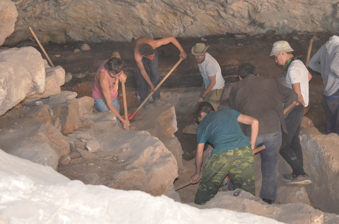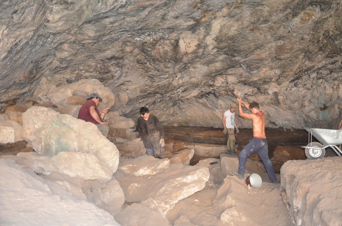 "Пещерные люди", то бишь археологи за работой. В ходе производственной деятельности древние люди искусственно разогревали и охлаждали пещеру, что привело к обрушению потолков и нам пришлось разбивать и вытаскивать эти скальные плиты, чтоб добраться до культурного слоя