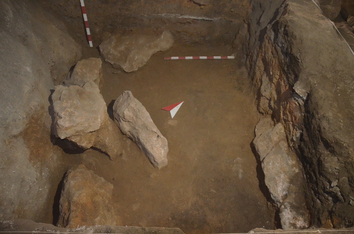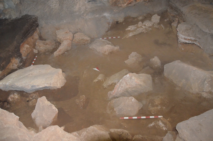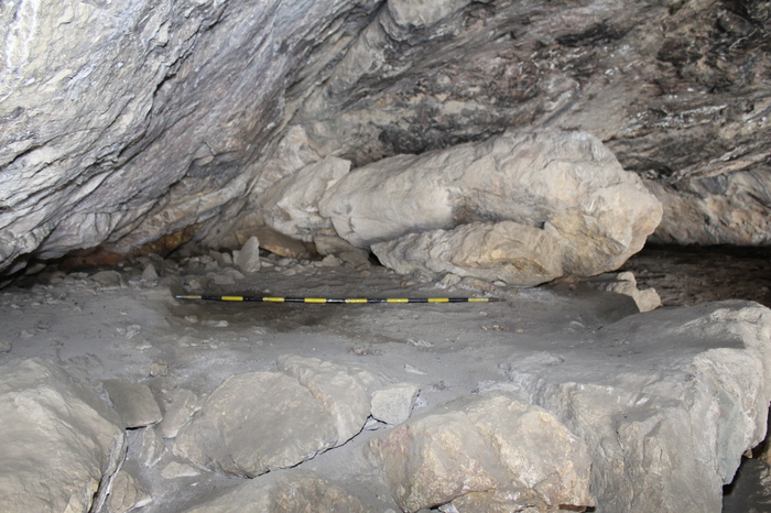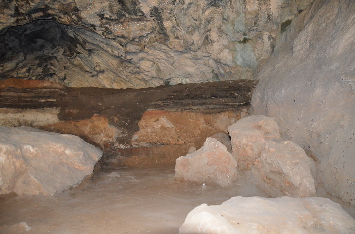 А это такая интересная часть в виде отслоившихся от потолка крупных плит, которые образовали вот такую "лежанку" 6,5х3м. На ее поверхности были каменные орудия труда найдены. Но полностью мы ее пока не расчищали.