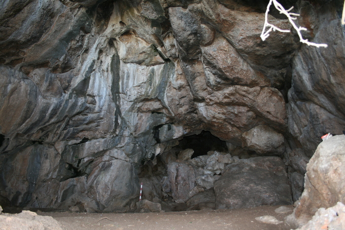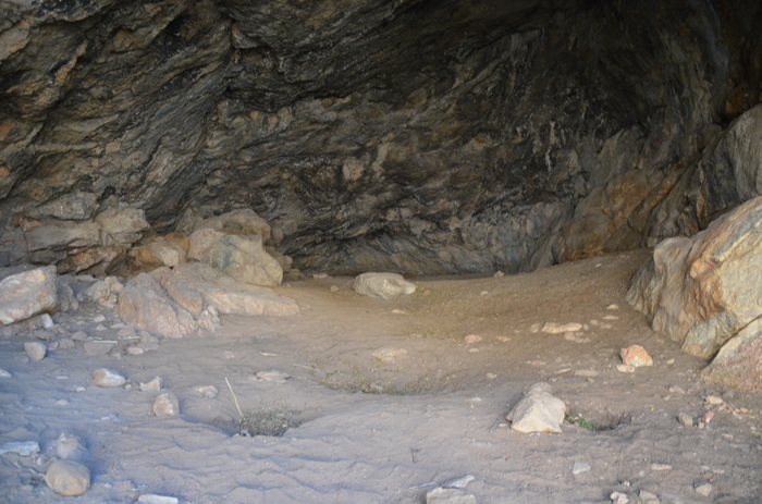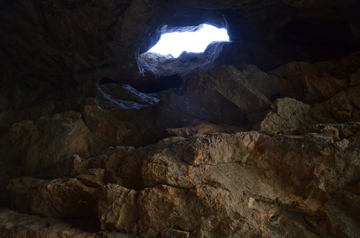 А это естественный воздушный канал, через который создавалась вентиляция пещерного пространства. В глубине пещеры, которая в длину была 30 м, высотой 6-7 м, максимально - 10 м, имелось еще одно такое вентиляционное "окно", которое сегодня завалено скальными блоками сверху.