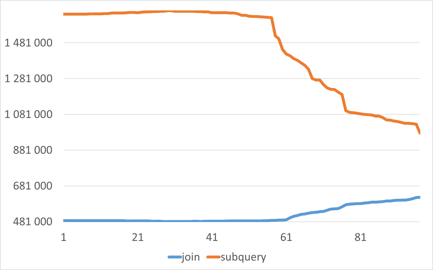 Результат ошеломил: в некоторых сценариях коррелированный подзапрос показал кардинальное превышение производительности над классическим JOIN. Это наглядный пример того, как теоретическая стоимость запроса, которую мы видим в EXPLAIN, может быть совершенно не релевантна при оценке реальной производительности системы в целом.