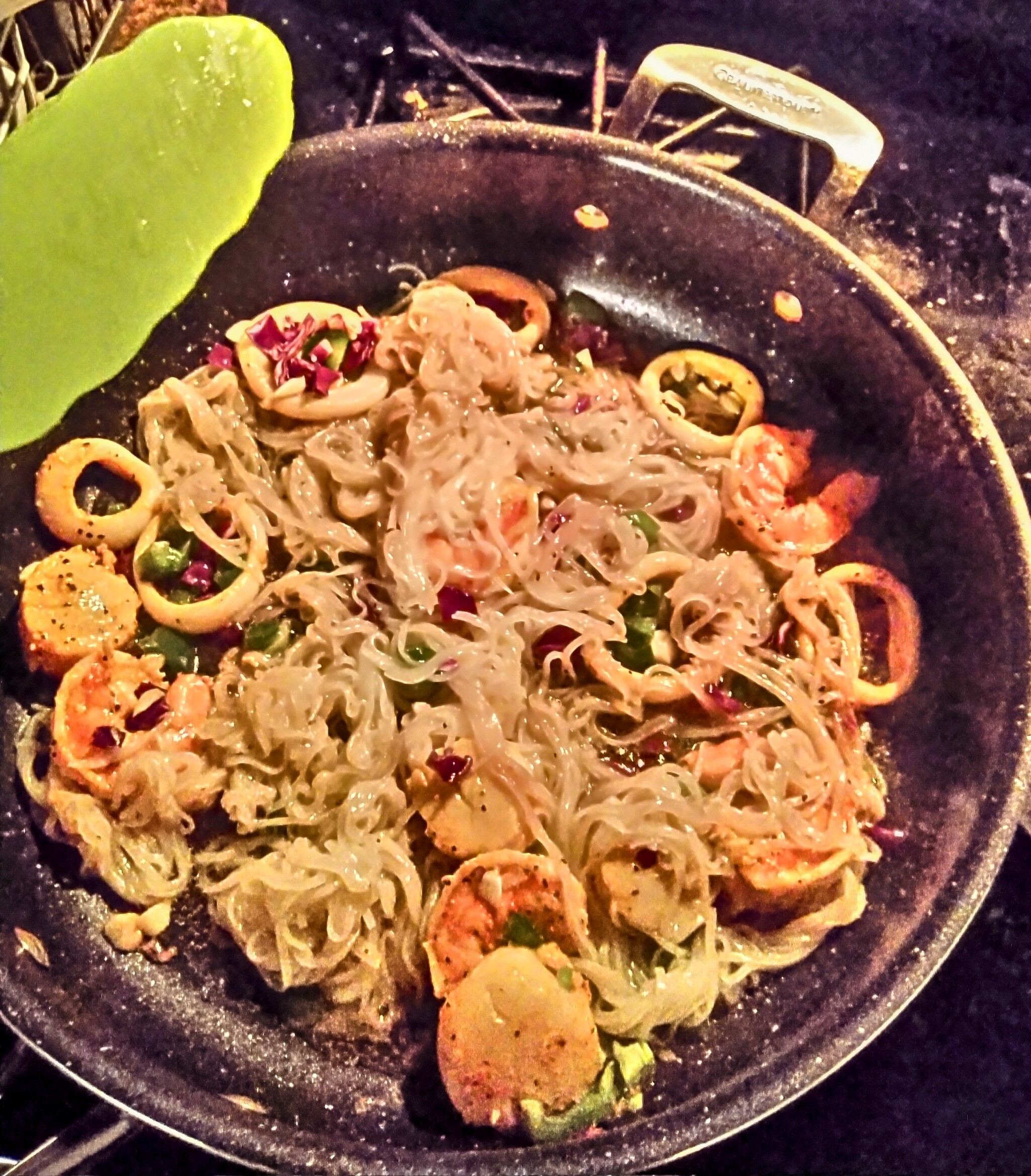 Рисовая лапша готовится очень быстро, через 3–4 минуты я перекладываю ее в другую кастрюлю, где находятся морепродукты и овощи.