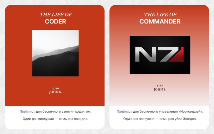 Зачем мне делать обложку для случайного человека, когда я могу сделать ее для коммандера Шепарда! Ну если бы он собирал себе плей-лист... И цвет обложки можно поменять на оттенок красного из игры. А уж в игровой песочнице после темы я смогла дать волю фантазии — тут и картинка с логотипом N7, и градиент, и год войны со Жнецами. Короче, полноценная обложка для Шепа!