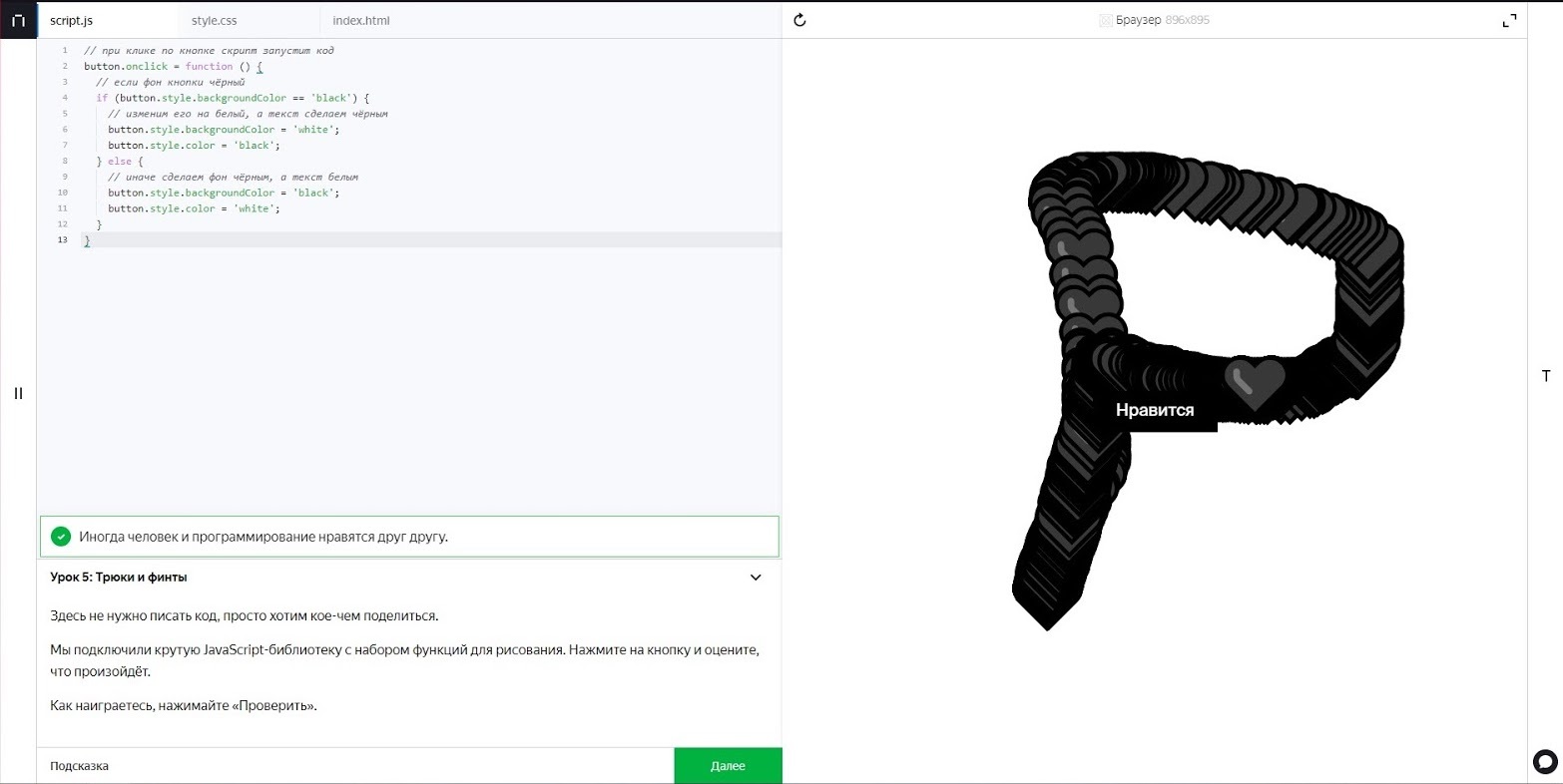Тема так и называется. В ней шесть уроков, результатом которых стала черная кнопка. Ну, вообще-то, сначала она была оранжевой и ничего не делала, а моей задачей было заставить ее функционировать. Перед этим надо было разобраться, что за звери такие — HTML, CSS и JavaScript, и что они делают. По большому счету первый создает некий объект (в нашем случае ту самую кнопку), второй говорит, как он должен выглядеть, а третий заставляет ее действовать. Ничего сложного, правда? На это у меня ушло часа три. Или пять. Но в результате кнопка все-таки стала менять цвет с черной на белую при нажатии и наоборот. Ни разу не магия, хотя выглядит именно так по мнению любого человека не из IT.