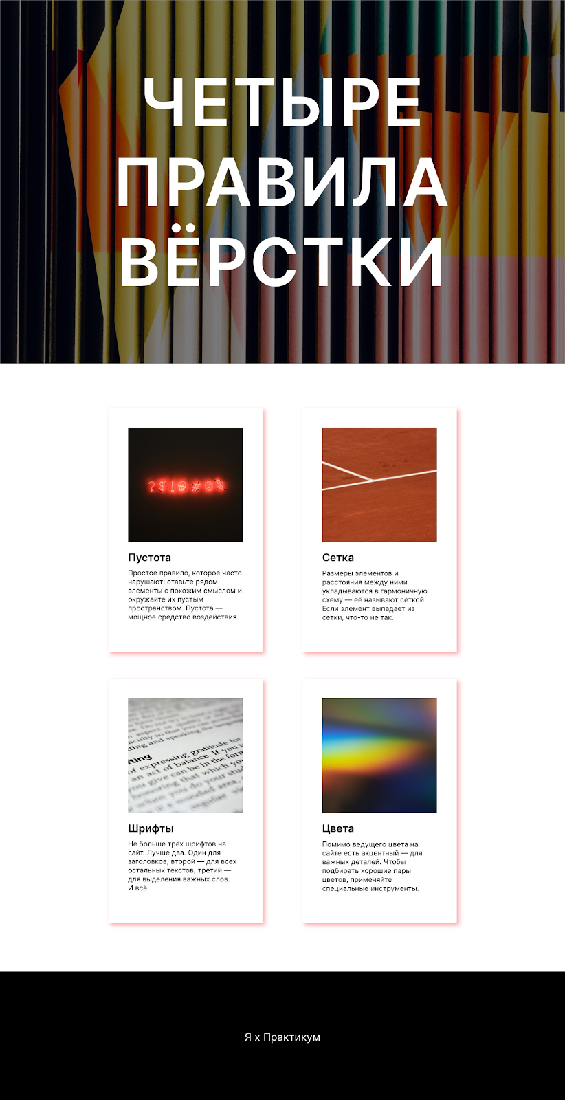 Задание в этой теме — за 11 уроков создать лендинг (целевая веб-страница) для поиска верстальщиков, который бы показал базу дизайна. Вот такой.