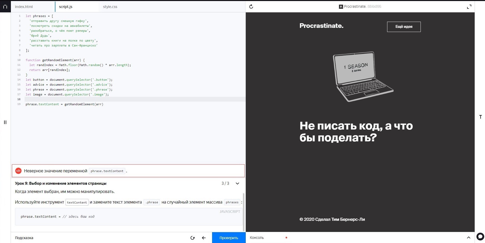 Кое-где приходилось гуглить названия терминов, иначе совсем не понятно. Например, почему массив назвали словом «arr»? Однозначно мне нужен словарь. Еще стали слегка напрягать шуточки после каждого правильно выполненного задания. Лучше бы там были повторные объяснения, почему важно сделать так и не иначе. До этого момента подсказками я почти не пользовалась, а тут без них никак. Местами они были или слишком очевидны (Вставьте let randomElement = getRandomElement(phrases); в такое-то место), или чуть ли не зашифрованы. А еще пару дней плохо загружалась страница с заданиями, хотя с интернетом все было нормально. Яндекс.Практикум, не болей!