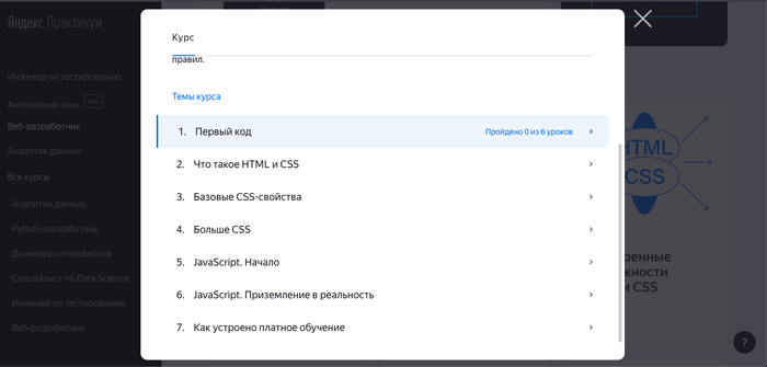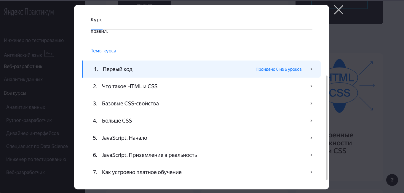 Вводный курс по веб-разработке от Яндекс.Практикума дает азы профессии. Вы знакомитесь с правилами HTML-разметки и учитесь работать со стилями: управлять цветом, шрифтами, расположением блоков. На примере двух проектов вы освоите базовый синтаксис HTML и CSS и поймете, что из себя представляет JavaScript. Полученный опыт программирования поможет решить, точно ли вы хотите этим заниматься и насколько готовы осилить целый курс.