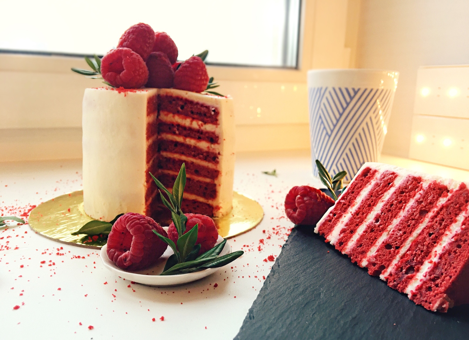 Красный бисквит с шоколадом и сливочным чиз-кремом🤪, украшенный свежей малиной.