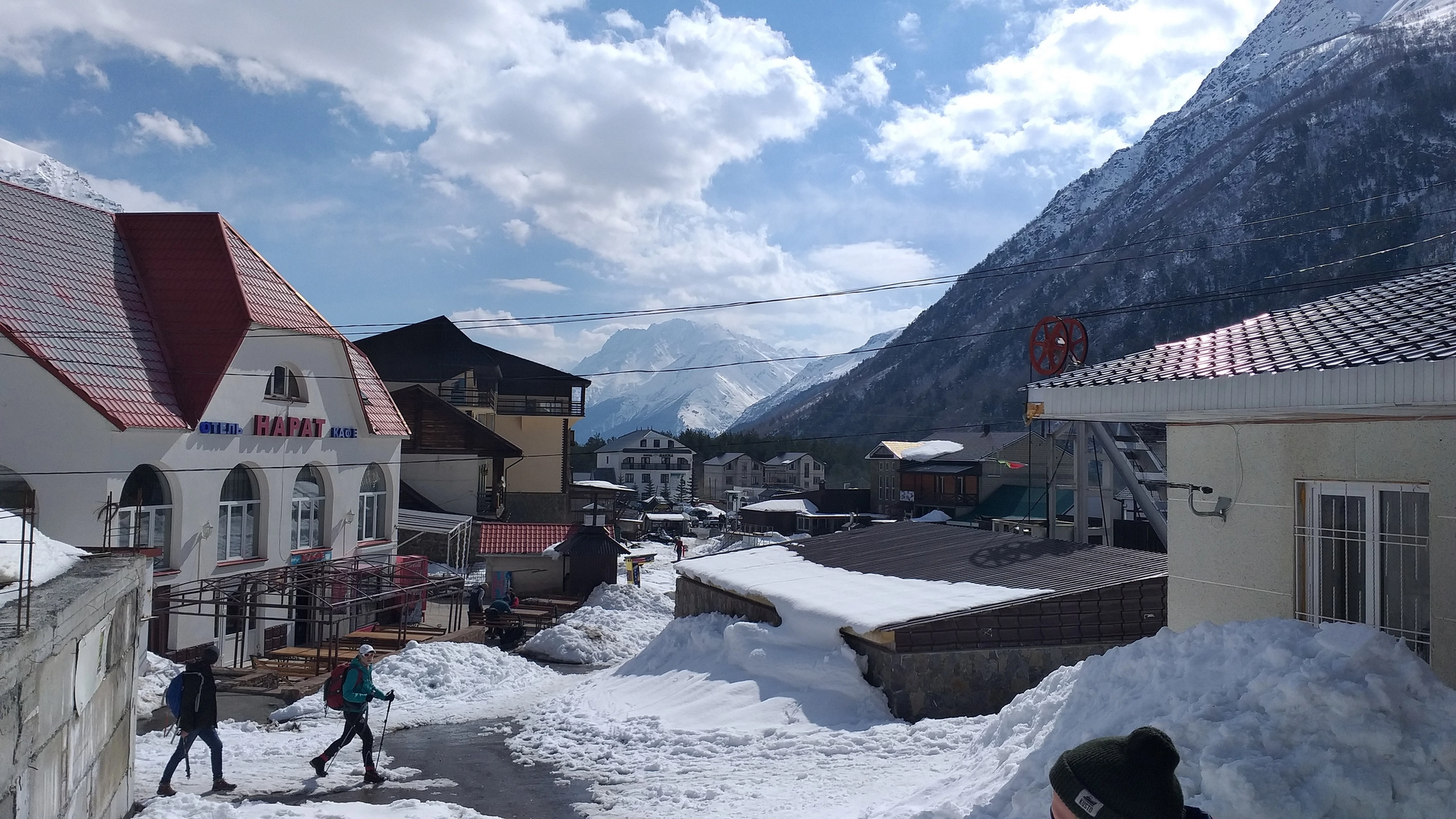 Сначала мы поднимались на соседнюю с Эльбрусом гору Чегет (3769м). У подножья горы открыты гостиницы, кафе и магазины в очень приятном альпийском стиле.