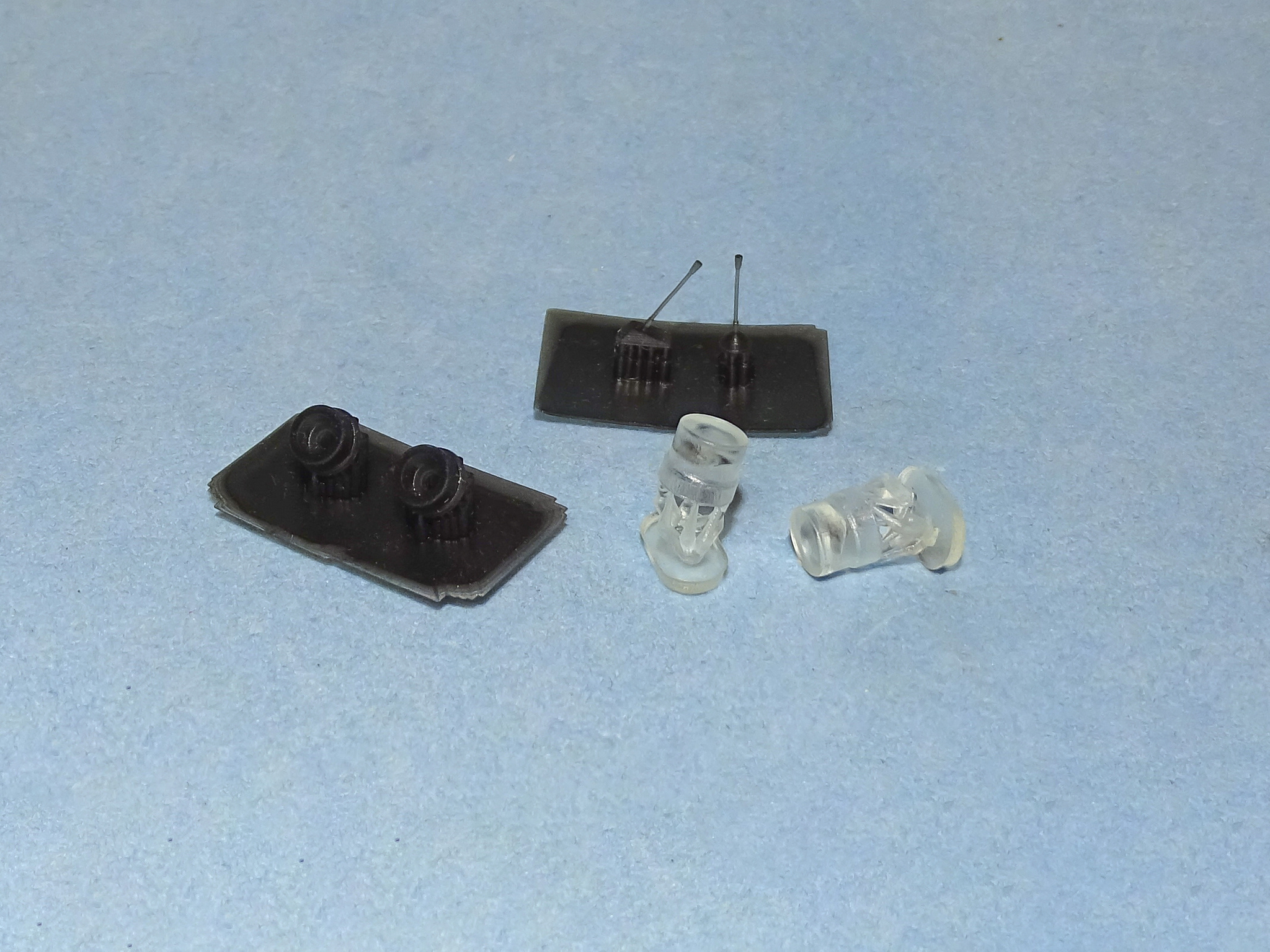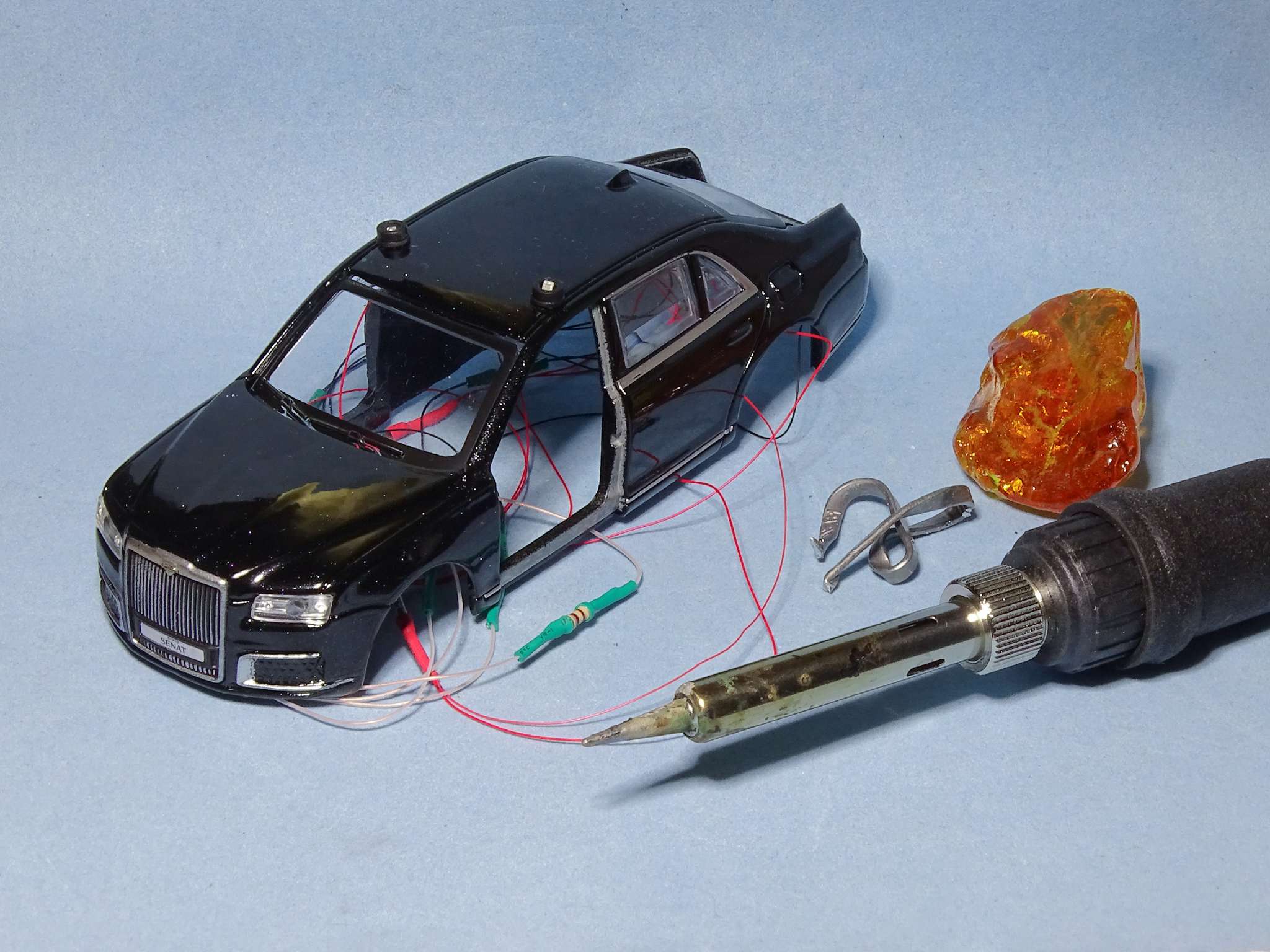 Далее вклеим светодиоды и спаяем электрическую цепь! Сама цепь подразумевается трехпозиционной: фары + задние фонари, мигающие проблесковые огни и свет в салоне.
