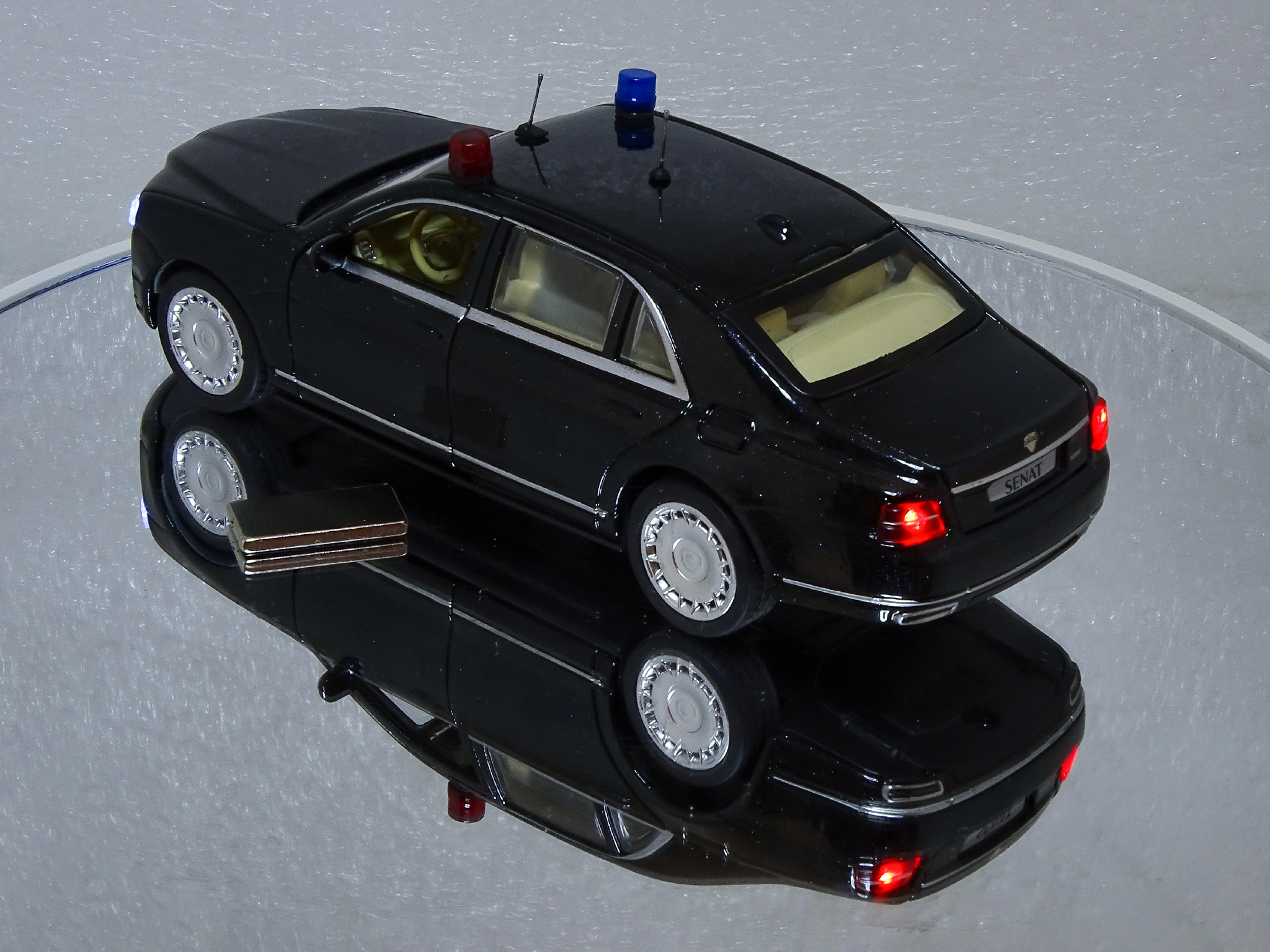 Рис. 9. Электрифицированная и доработанная модель автомобиля Аурус «Сенат» от «Технопарк» с горящими фарами и задними фонарями