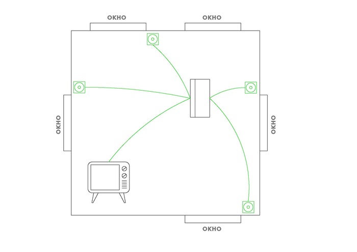ТВ сигнал конечно мало сейчас развит. В теории может получится и комнатной антенной поймать 20 бесплатных цифровых каналов рядом с телевизором, но на всякий случай можно за штору, на высоте 2,2м примерно, рядом с розеткой для моторчика штор, на каждую сторону вывести ТВ розетку, сплиттер в шкафчике, и от него уже развести по теликам. Плюсом прокинуть кабель от шкафчика на крышу, лишним не будет, если ни у кого из соседей не подсмотреть.