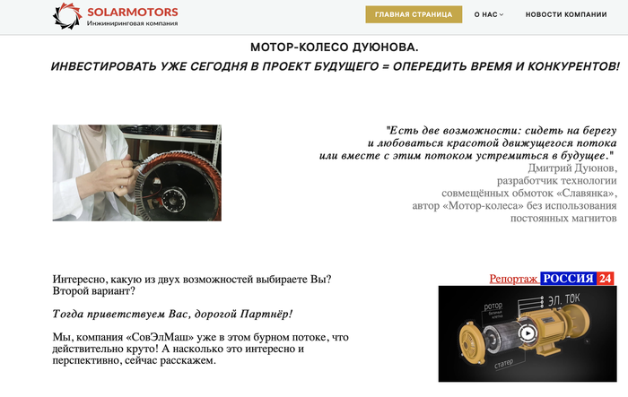Если погуглить компанию - создателя автомобиля, то мы наткнемся на сайт инжиниринговой компании Solar Motors https://motor-duyounowa.com/ehlektromobil_zetta_zetta_el_pan.... На сайте нас приветствуют как будущего партнера и предлагают поучаствовать в проекте. И не просто поучаствовать, а инвестировать в сие мероприятие, став совладельцем новой компании.