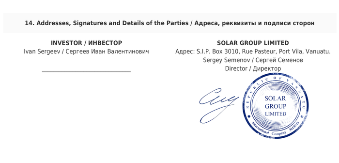 Партнерская программа также присутствует. Работают ребята минимум с 2017 года. Сайтов 2: один принадлежит Дуюнову (do you know?). Это такой Петрик, но он изобрел специальную обмотку для электродвигателей. Разоблачение можно нагуглить на ютубе - https://www.youtube.com/watch?v=usQoyU2i-XE. Именно этот человек якобы создает двигатель автомобиля.Второй сайт https://reg.solargroup.pro. На нем собираются деньги для аборигенов Вануату. Там же присутствует ссылочка на другие проекты по инвестированию https://in4-team.com/startapy/. Ну правильно, любой бизнес нужно масштабировать.